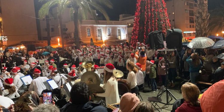 A continuación, Tur y dos pequeños del coro de la Escuela Municipal de Música han accionado la palanca que ha encendido el gran árbol y el resto de adornos navideños de todas las Parroquias. Seguidamente, se ha empezado el recital previsto por parte de la Banda Municipal Juvenil y el coro de la Escuela de Música que incluye a los alumnos más pequeños, aunque únicamente han podido ejecutar su versión de ‘El Tamborilero’.