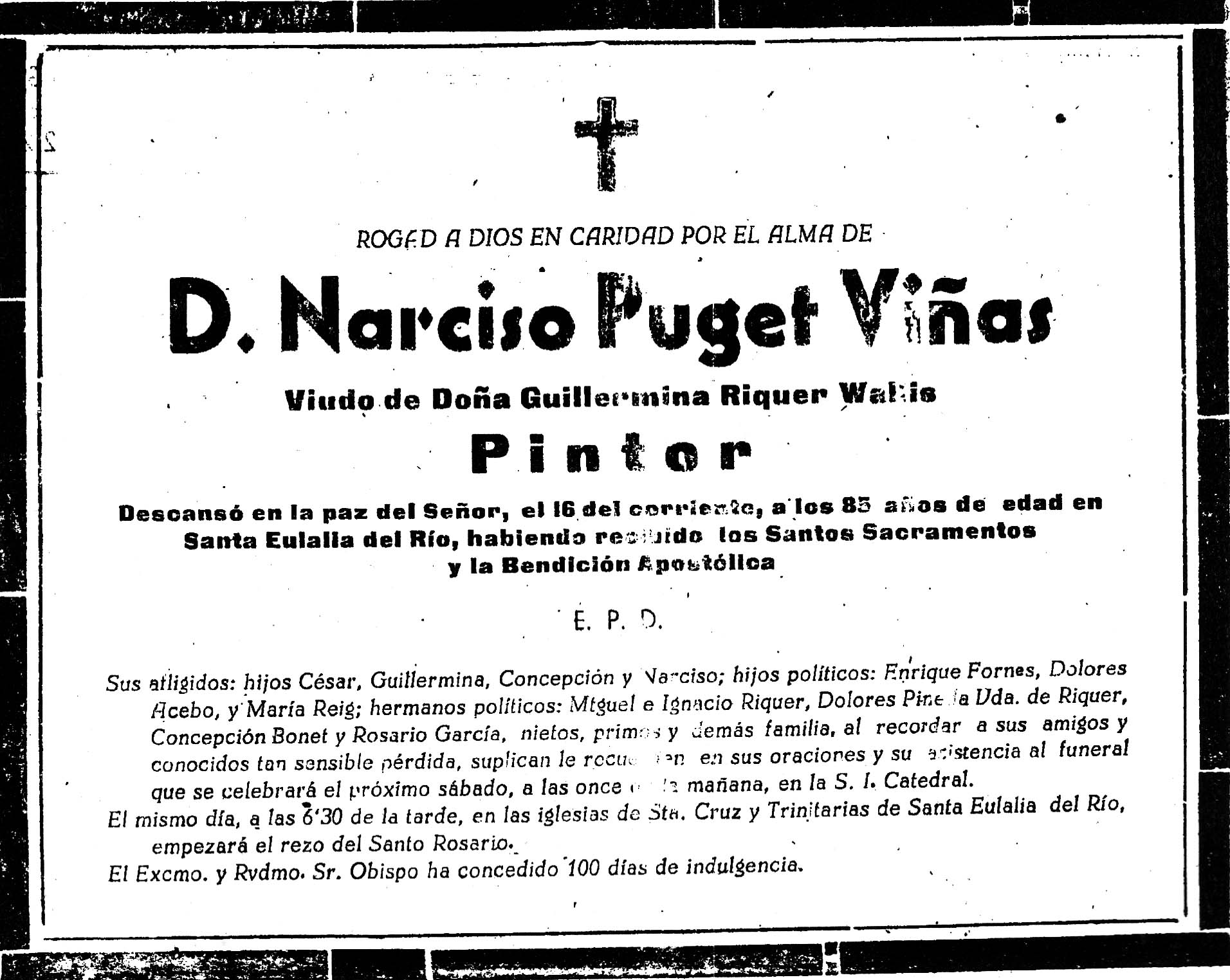 Esquela de don Narciso Puget Viñas, aparecida en el Diario de Ibiza del 28 de enero de 1960.