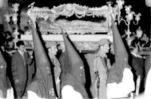 La primera procesión del Viernes Santo de esta última época, que cumple este año su 75 aniversario, hizo el mismo recorrido que se siguió desde tiempos anteriores y que se mantuvo durante muchos años, habiéndose acortado estos últimos años a su paso por el paseo de Vara de Rey. De aquella primera procesión del Santo Entierro quisiera trasladarles a ustedes las impresiones del cronista del Diario de Ibiza de la época sobre el particular: “La realidad (fue) superior a toda previsión. Porque no acudieron las entidades sociales invitadas solamente con sus presidentes y los anunciados conductores (12 por entidad), sino, en general, con el pleno de sus socios. Y fue tal el número de los que formaron en la procesión, que nunca se vio otra en nuestros tiempos que igualara a ésta en concurrencia (…) Pocos hombres quedaron de la Ciudad y de la Marina, de toda condición y estado, sin incorporarse a sus apretadas filas, realmente interminables. Ni fueron solo doce, conforme al cálculo, los conductores de cada turno, sino que llegaron en ocasiones a veinte”.