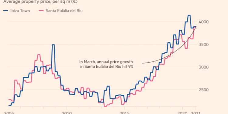 El aumento de precios, tal y como recogen en el gráfico que han elaborado, no es un freno para el aumento de la demanda de compradores. De hecho, detallan que el precio del metro cuadrado en Ibiza ciudad y Santa Eulària ronda los 4.000 euros y que adquirir una casa de campo nueva en Sant Josep supera los 2 millones de euros o una villa en Cala Carbó los 5 millones. Según explican desde Engel&Völkers Ibiza al Financial Times, este año han vendido un 50% más de casas que en el mismo periodo de 2.019.En este sentido, indican que también aumentó el precio, un 29% de media más que el año anterior.