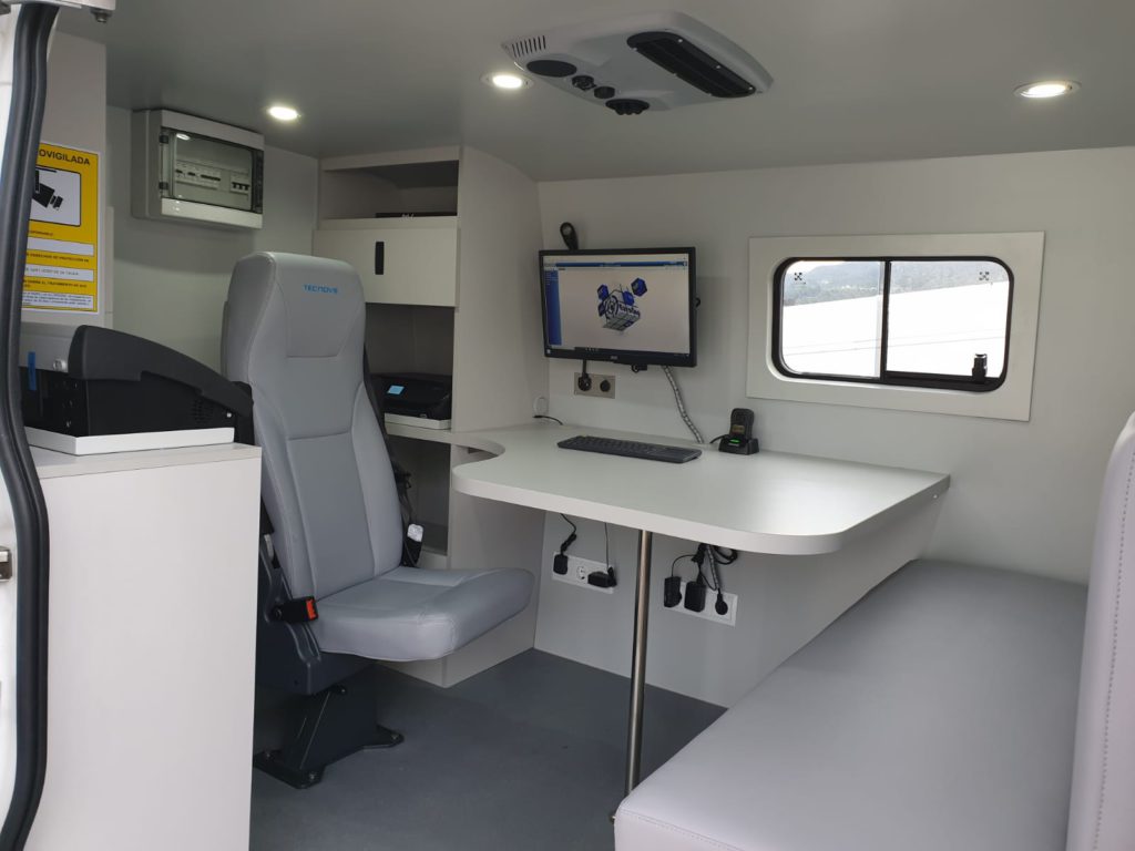 El furgón dispone también de un terminal conectado a las bases de datos policiales y dispone de una impresora multifunción, un desfibrilador semiautomático, material de señalización y de oficina.