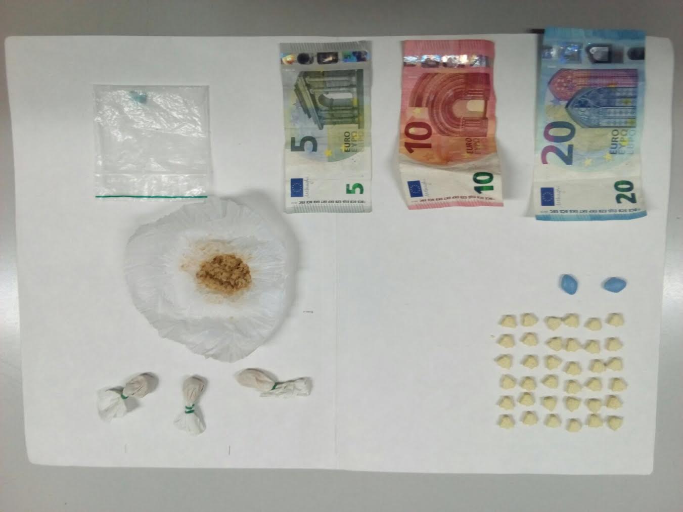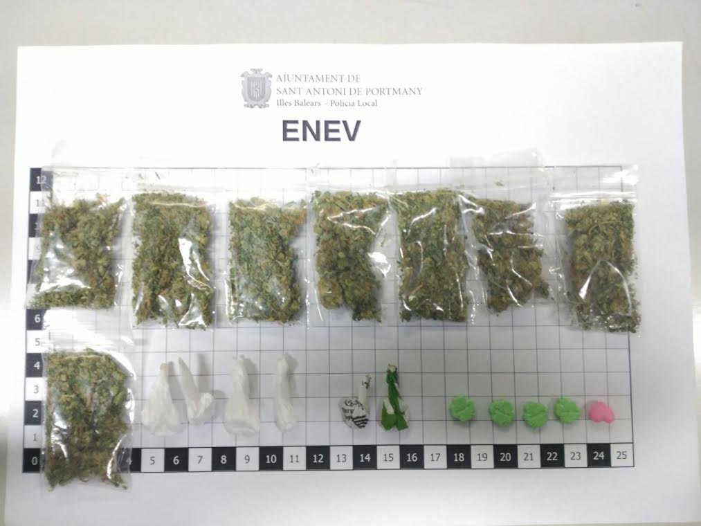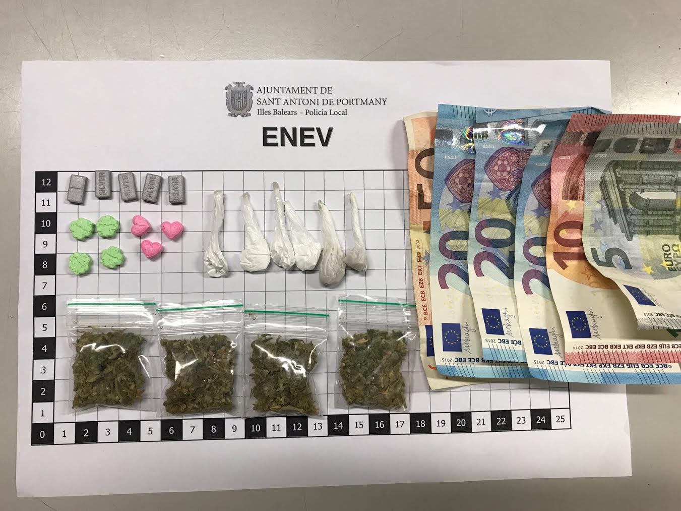 Los agentes solicitaron al individuo que mostrara el contenido de la riñonera que portaba consigo y este intentó lanzarla. En su interior se hallaron diferentes sustancias tóxicas y algo de dinero. A falta de confirmar mediante análisis, se incautaron 38 pastillas de éxtasis y cuatro dosis de cristal.