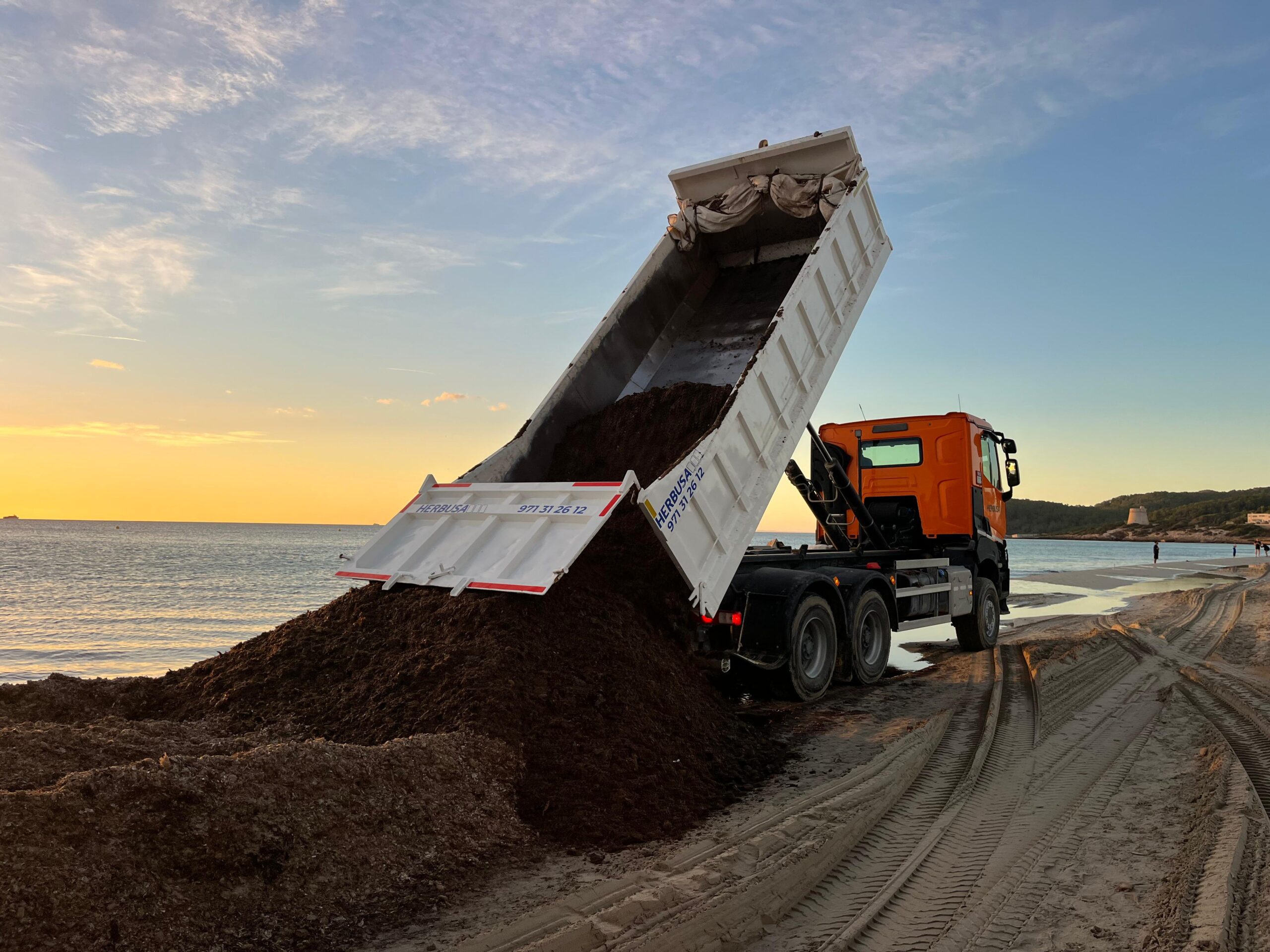 Un camión descarga posidonia en la costa de Sant Josep.