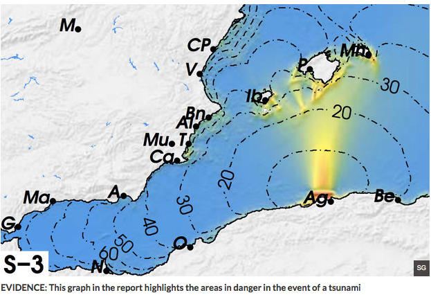 «Ibiza y Menorca son los que más están en riesgo, lo que indica un nivel de peligro de cuatro de cinco. Esto significa que hay una severa amenaza de la tierra con elevaciones máximas de ola», cita el periódico sobre los documentos. «La zona quedaría sumergida por olas gigantes de hasta cuatro metros de altura, mientras que Mallorca, Alicante y Murcia, inundadas por dos metros de altura. El tsunami tardaría unos 20 minutos en llegar a Cartagena, 30 minutos a Formentera e Ibiza y 40 minutos a Menorca», añade.