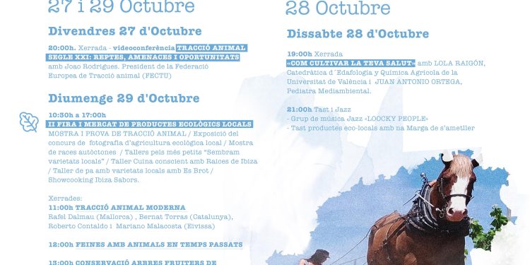 Allí habrá un mercado de productores y productoras de agricultura ecológica local, una demostración y prueba de tracción animal, una muestra de razas autóctonas, una exposición del concurso de fotografía, la exposición ‘Mutatis’ de la artista Romanie, talleres de pan y de «cocina consciente», un showcooking a cargo de Ibiza Sabors y un taller de variedades locales para los más pequeños, entre otras actividades.