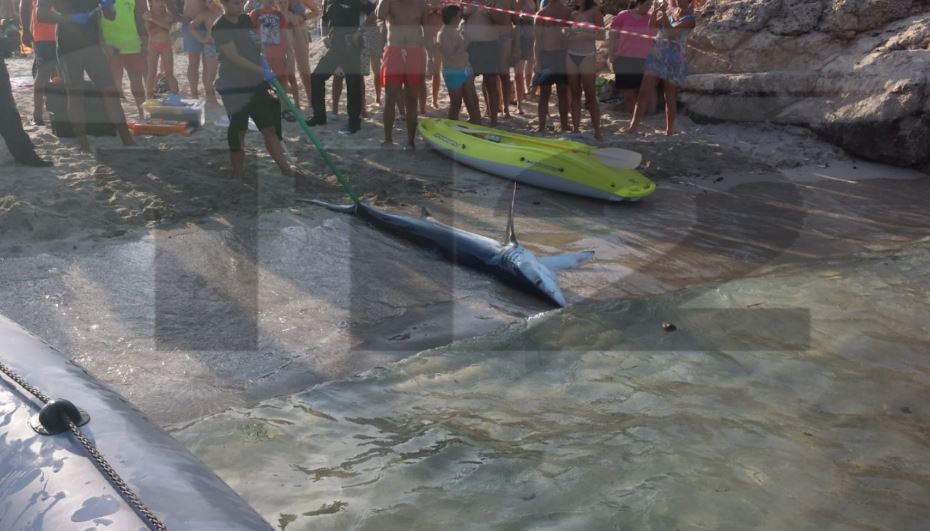 EFE / La tintorera por la que ayer por la tarde desalojaron un par de horas Cala Domingos Petit, en Manacor, tenía un aguijón de raya clavado en el hocico que probablemente le afectó al sistema nervioso causándole la desorientación y el varamiento que presenciaron decenas de bañistas.
