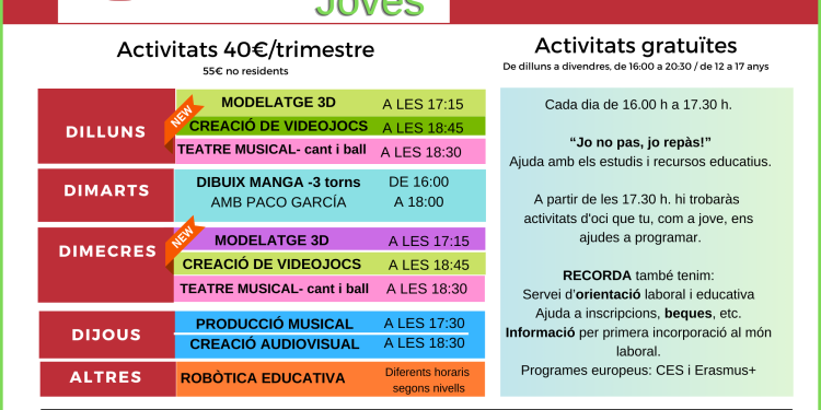 Activitats amb inscripció prèvia i un preu de 40 €/trimestre per a residents o 55 €/trimestre per a joves de fora de municipI.