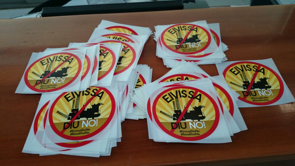 @Noudiari / El Consell editó el pasado viernes 5.000 pegatinas contra de las prospecciones petrolíferas que puso a disposición de los ciudadanos gratuitamente. Se agotaron en solo tres días . El lunes no quedaba ni una, una muestra más del clamor popular que existe en la isla contra los planes de las petroleras, que pretenden agujerear el subsuelo marino de las Pitiüses en busca de hidrocarburos. En vista del éxito de esta iniciativa, la máxima institución insular ha solicitado una segunda tirada, esta vez mayor, de 15.000 nuevos adhesivos de ‘Eivissa diu NO’, en cuyo fondo se ve una plataforma petrolífera tachada con una barra roja.