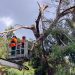 Los bomberos retiran una rama rota suspendida sobre un pino de grandes dimensiones en sa Cala