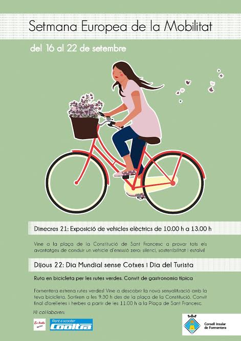 I el dijous 22 de setembre se celebrarà una bicicletada per les Rutes Verdes de l’illa. La trobada serà a les 9.30 hores a la plaça de la Constitució. Després els participants aniran fins Cala Saona enllaçant 3 de les 32 rutes verdes que hi ha a Formentera, i que ja compten amb la nova senyalització instal·lada, segons ha explicat Rafael González que encapçalarà aquesta excursió juntament amb la consellera de Turisme, Alejandra Ferrer.