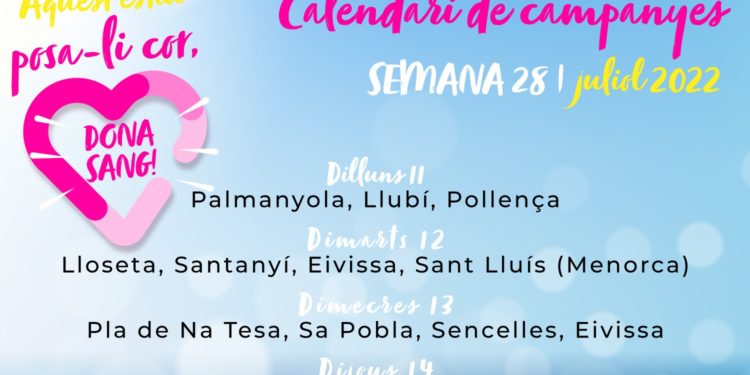 Así, se ha difundido esta mañana los días y horarios en los que se podrá donar sangre en Ibiza (en el Banc de Sang d’Eivissa, Hospital Can Misses Vell) esta misma semana: mañana, el martes 12 de julio, y el miércoles 13 de julio de 17.00 a 21.00 horas en ambos casos. Es importante pedir cita en la web: www.donasang.org e hidratarse bien antes y después, lo que mejora la experiencia de la donación de sangre. Se pueden consultar las campañas del resto del mes de julio en Baleares a través del siguiente enlace: http://www.donasang.org/on-puc-donar/calendari/list.php?month=07&year=2022. En Ibiza también se podrá donar sangre los días 26 y 27 de julio.