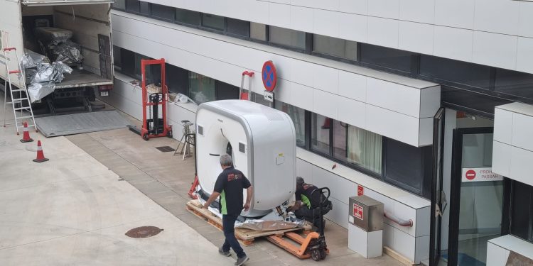 El aparato de Tomografía Axial Computarizada (TAC) ha llegado hoy y se prepara su instalación para estos próximos días. Algo que es posible gracias a que las obras de adecuación del espacio en el que irá ubicada esta nueva tecnología ya han finalizado, adelantándose a las previsiones iniciales, según informan desde el Área de Salud de Ibiza y Formentera.