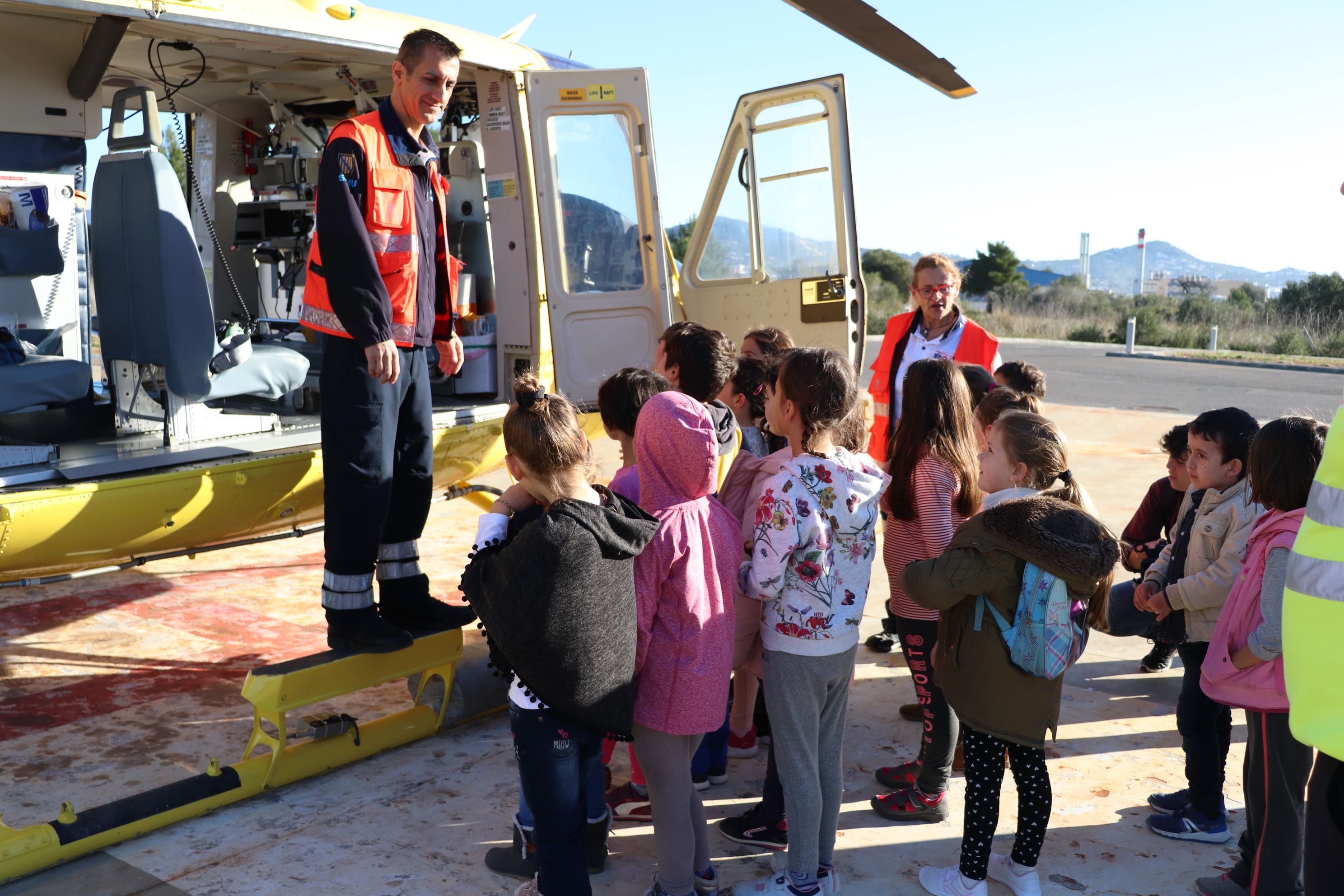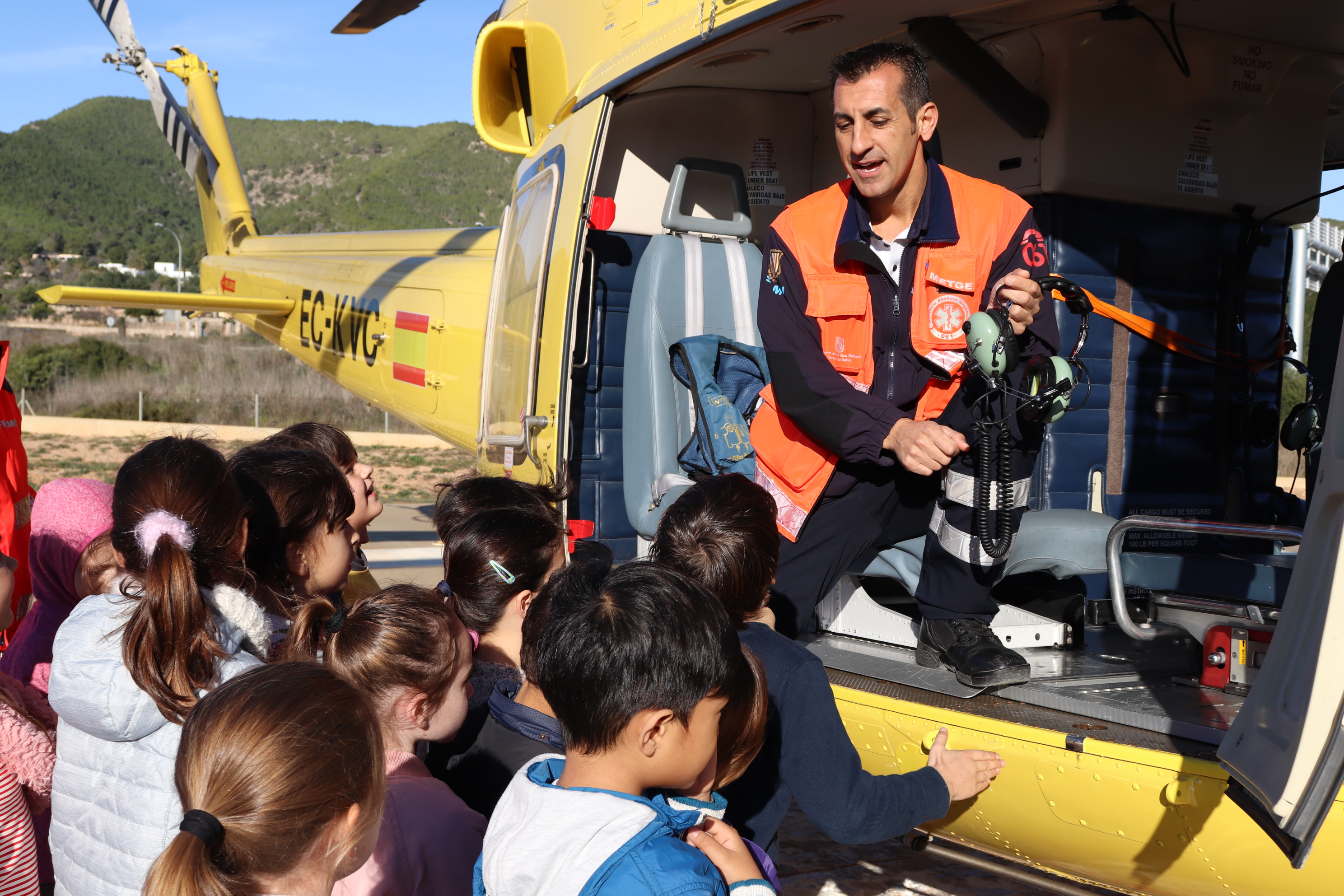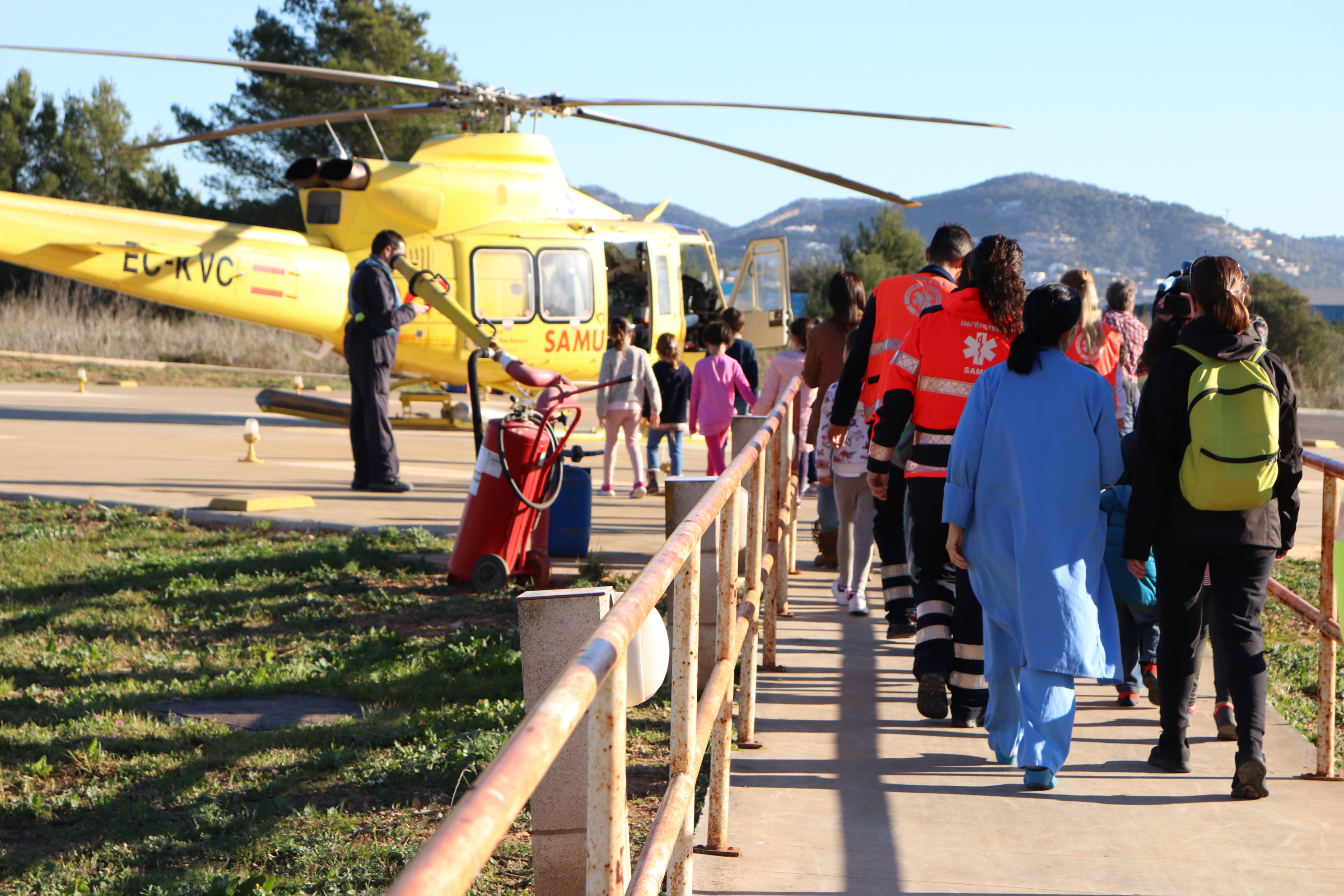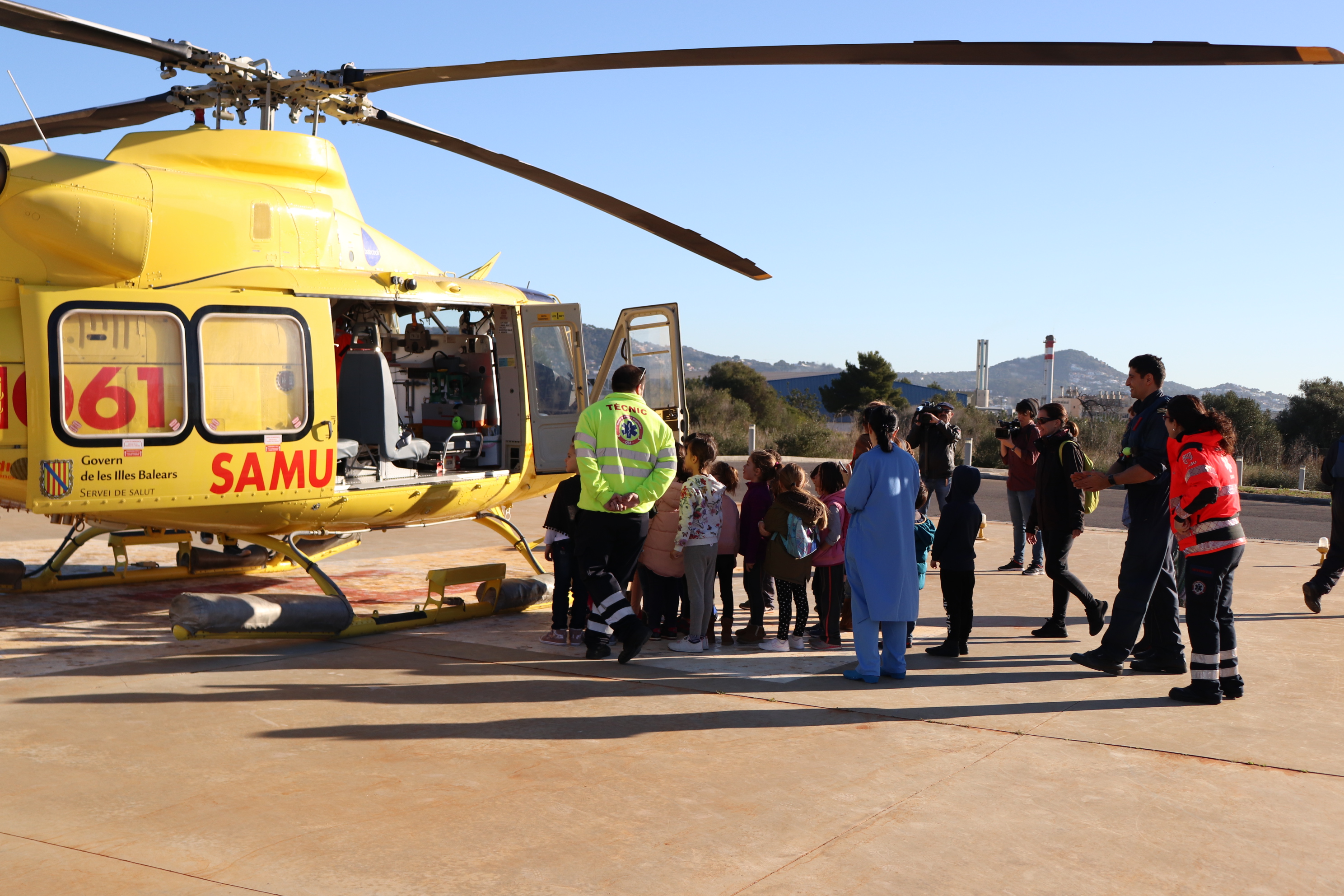 Profesionales del servicio SAMU 061, entre los que se encontraban el coordinador de Ibiza y Formentera, Ángel M. Crespo Martínez, las enfermeras Rosa Sánchez Santos y Virginia Muñoz Escuder y el técnico en transporte sanitario Antonio Martínez Jiménez, además de los pilotos Carlos Martínez y Narcís Milá, han explicado a los niños el funcionamiento de las ambulancias y helicóptero, cómo actuar en caso de emergencia y han asistido a un traslado real de un paciente en el helicóptero.