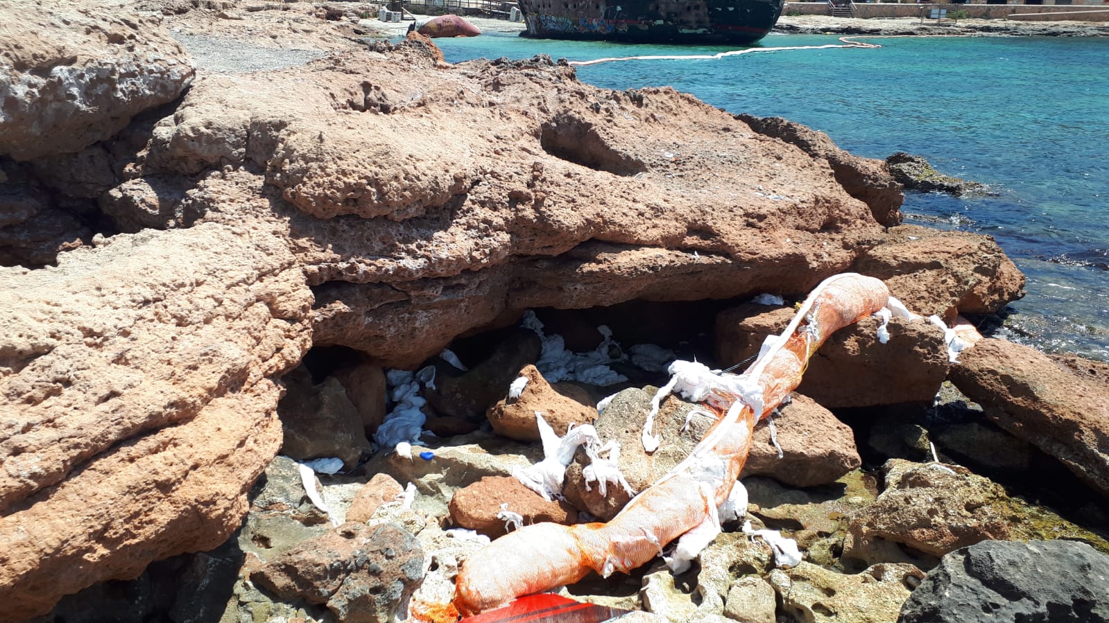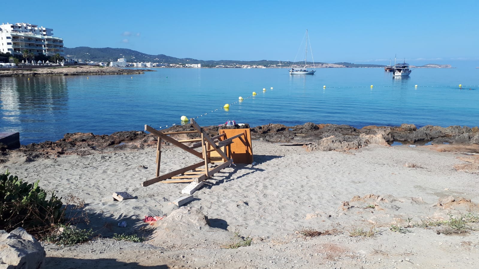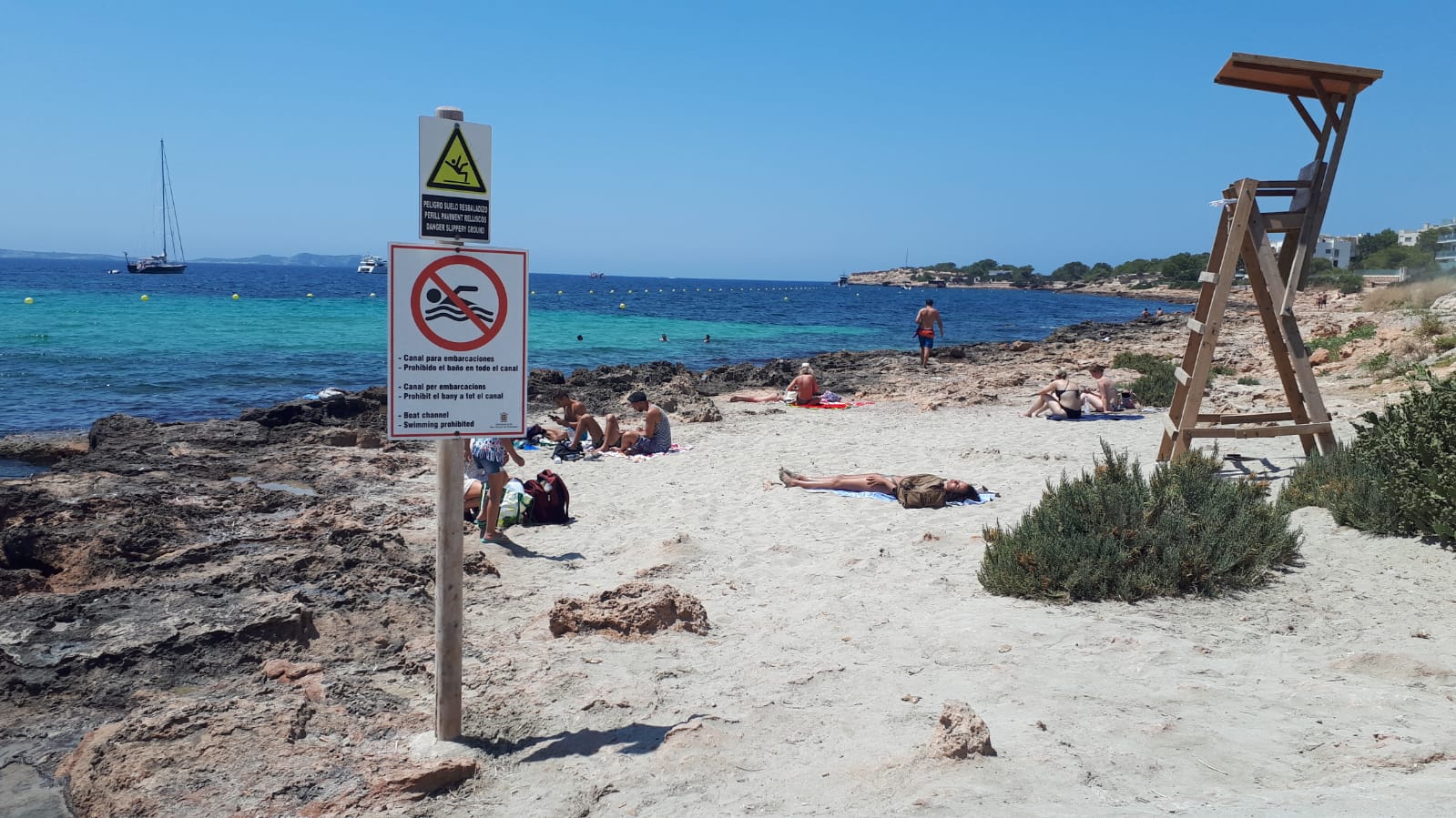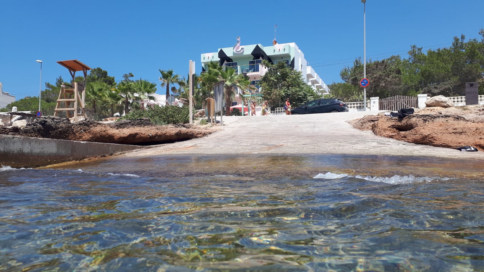 Este punto de la costa de Sant Antoni posee un acceso para embarcaciones cuya barrera de contención permanece destrozada sobre las rocas. Pese a la señal que indica que está prohibido el baño, las personas que hacen caso omiso se cuentan por decenas y los resbalones son una tónica habitual durante estos días en la rampa que da acceso al mar.