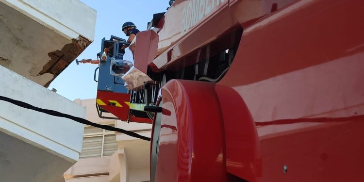 El operativo se ha llevado a cabo con la colaboración de la Policía Local y, como se aprecia en las imágenes que acompañan estas líneas, los bomberos han tenido que sanear a golpe de martillo el bajo de un balcón en muy mal estado.