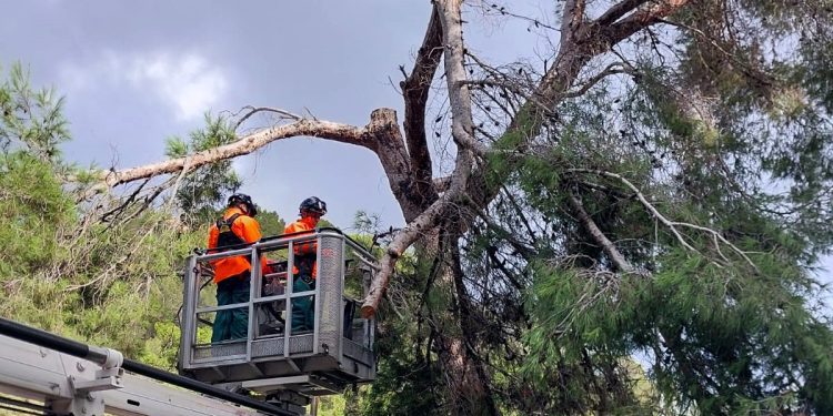 Las fuertes rachas de viento registradas ayer en sa Cala de Sant Vicent, en el municipio ibicenco de Sant Joan de Labritja, obligaron a los bomberos a realizar una actuación en esta localidad debido los daños causados en un pino situado en una zona de tránsito. Una rama rota quedó suspendida por un hilo y ante el peligro de que se desplomara sobre alguna persona, los efectivos del parque insular decidieron auparse a la copa del árbol con un autobrazo hidráulico desde el que hicieron caerla de forma controlada y cortaron otras que también entrañaban cierto riesgo de desplome, como se aprecia en las imágenes que acompañan estas líneas. En el operativo tomaron parte tres bomberos y un cabo.
