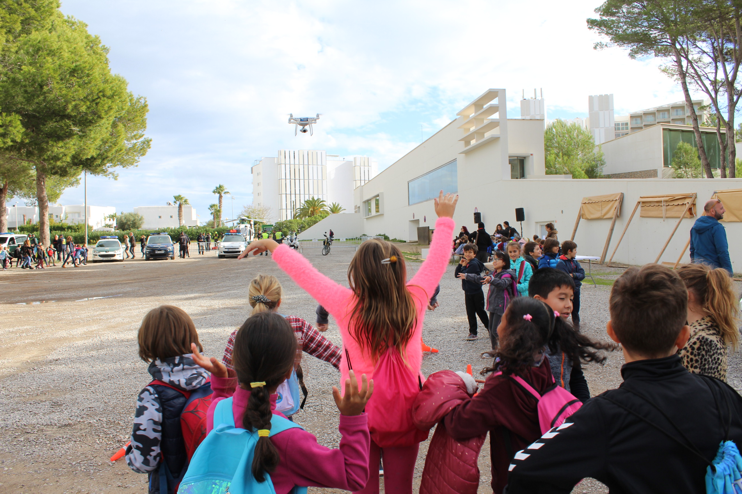 La lluvia ha obligado a recortar la exhibición de la Unidad Canina de la Policía Local de Sant Antoni y que los jóvenes no pudieran disfrutar de un simulacro de rescate con helicóptero de la Guardia Civil. Sin embargo, sí que han podido observar por las ventanas del Palacio de Congresos el despegue de esta aeronave y de la del 061, que también ha estado presente.