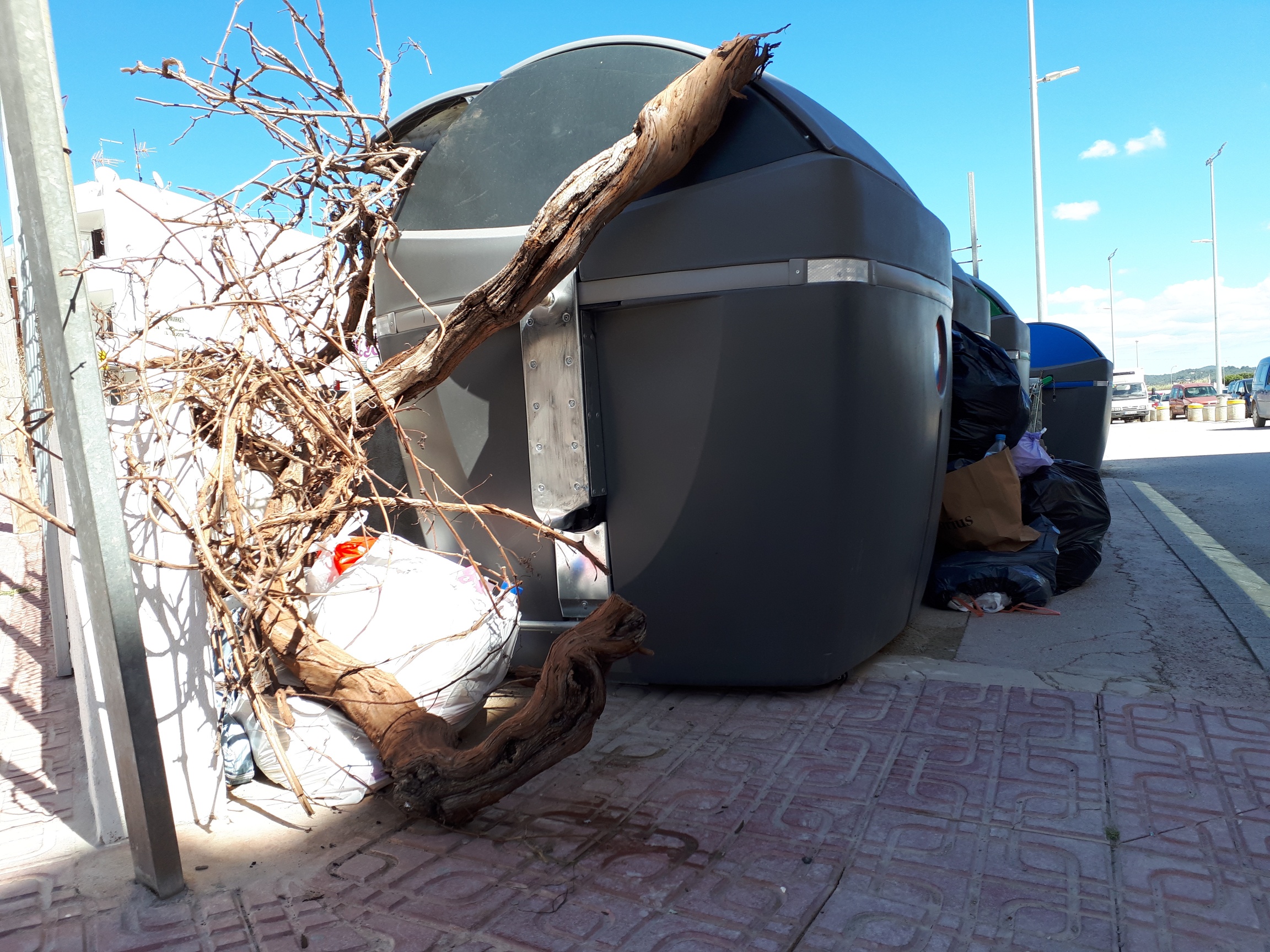 @Noudiari / Los contenedores de basura de Sant Antoni son testigos de centenares de muestras de incivismo cada día, unas acciones que aumentan a medida que se acerca la temporada de verano. Un vecino portmanyí denuncia los escombros, restos de poda y todo tipo de residuos que se acumulan en el parking de la calle Alacant con Ramon y Cajal.