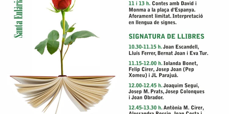 La parte de los libros estará acompañada por dos cuentacuentos a cargo de David i Monma. Serán en la plaza de España, delante del Ayuntamiento, y contarán con intérprete de lenguaje de signos. Los horarios serán a las 11:00 y a las 13:00.