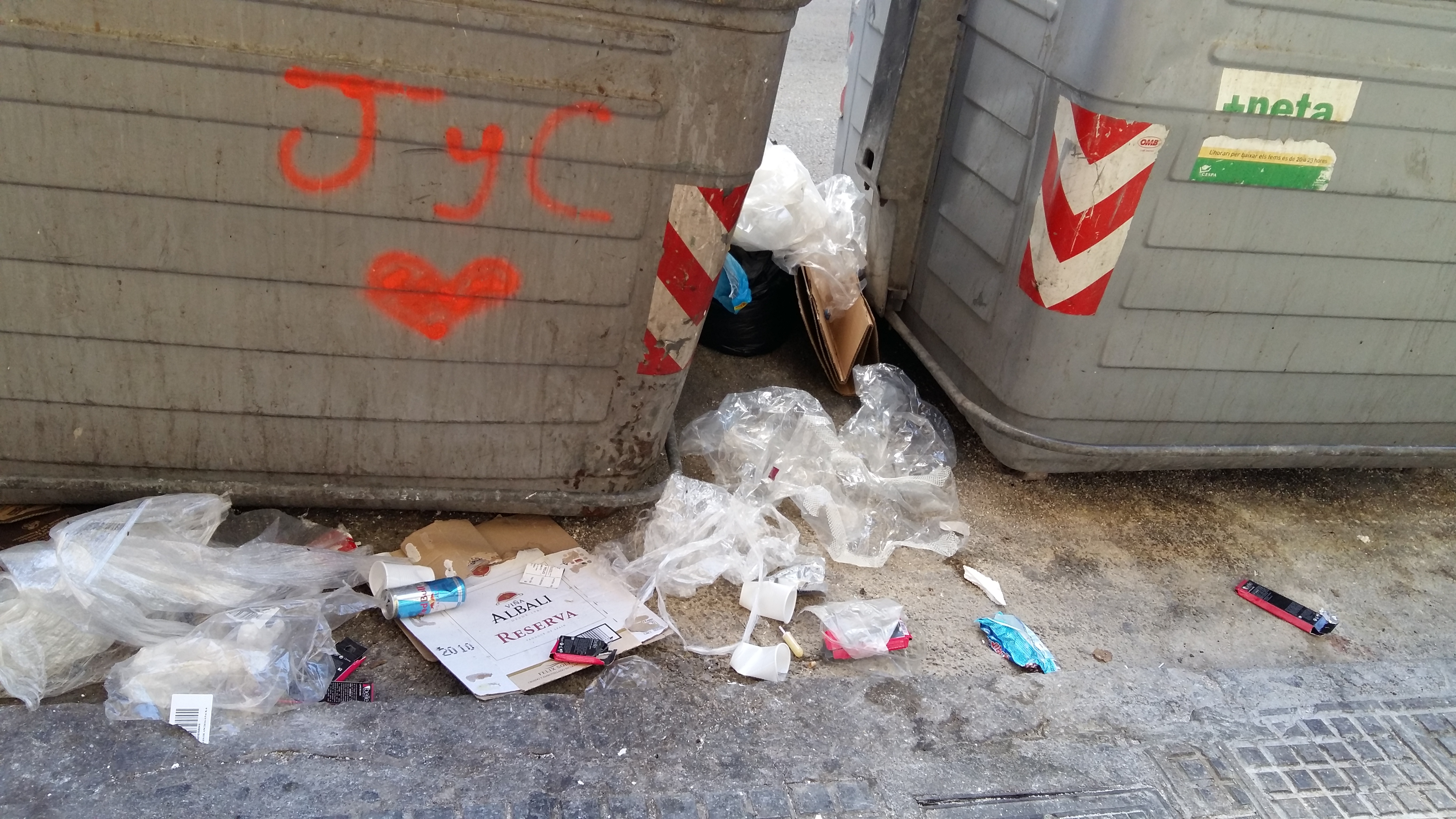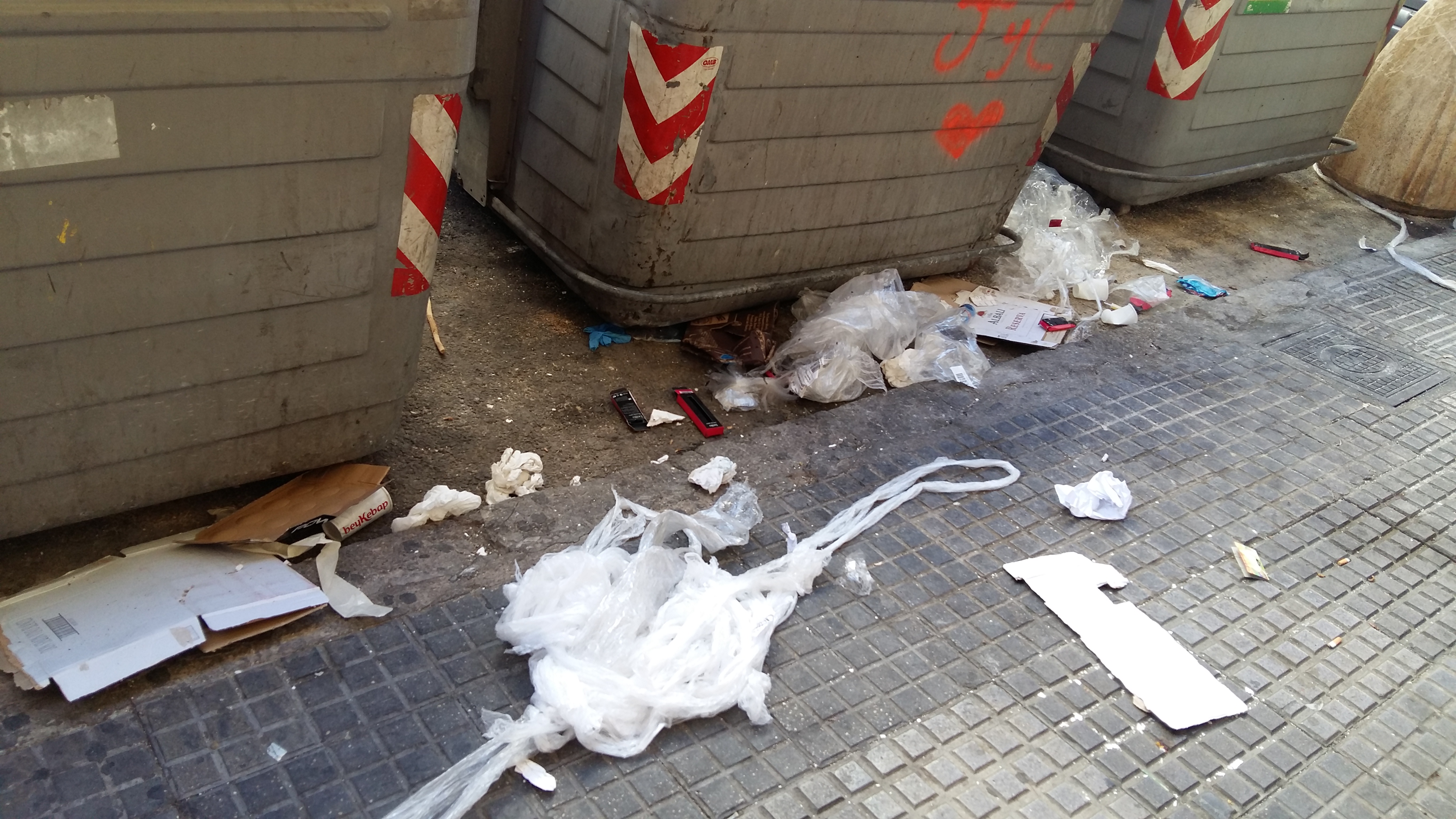 @Noudiari/Los vecinos de la céntrica calle de Vila Bisbe de Abad y Lasierra han denunciado esta mañana la suciedad de esta zona, con imágenes tomadas a las 9.20 horas, que muestran residuos de toda clase, principalmente plásticos, cartón y latas, tirados bajo unos contenedores, también sucios. Una imagen que los vecinos han calificado de «vergonzosa».