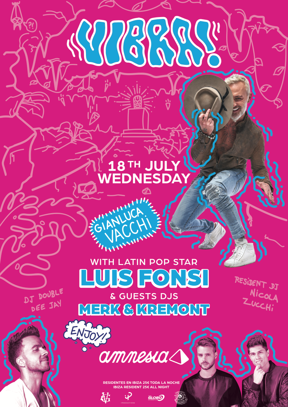 La actuación de Luis Fonsi toma el testigo a los conciertos ofrecidos durante las últimas tres semanas por Danny Ocean, J Balvin y J Quiles. La cuarta sesión de una fiesta que reunirá este verano en Ibiza al abc del pop latino bajo la batuta de Gianluca Vacchi, anfitrión y DJ de Vibra! Además, esta semana Gianluca Vacchi recibe en la cabina de la Terraza del club al dúo italiano Merk & Kremont quienes pondrán el toque house a una noche que promete vibraciones muy veraniegas.