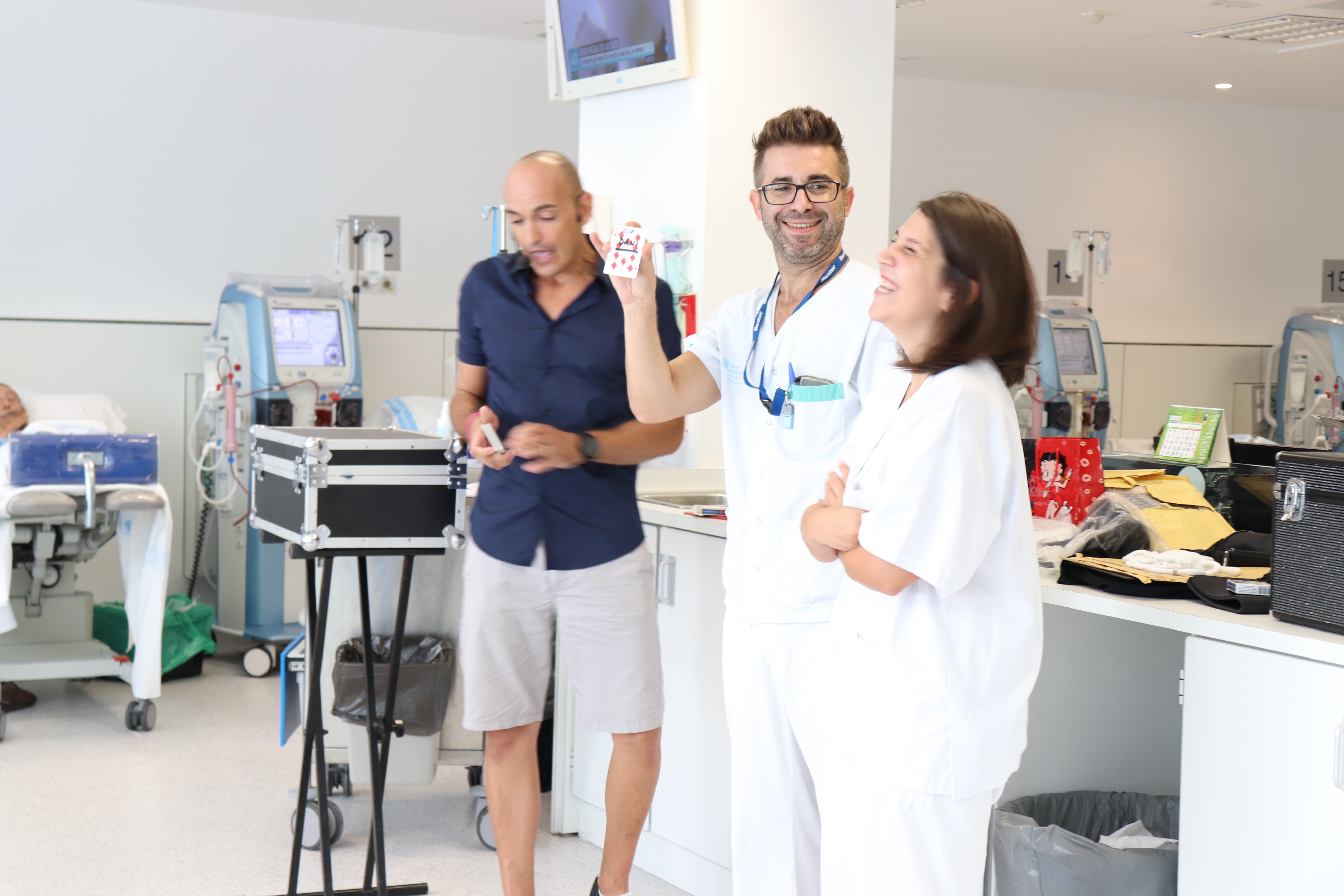 @Noudiari / Los 15 pacientes de hemodiálisis y los 10 pacientes del hospital de Día onco-hematológico, acompañados de familiares y el personal de ambos servicios han contado en la mañana de hoy con la visita del Mago Albert, dentro de la iniciativa de humanización de la atención sanitaria, Plantagrama.