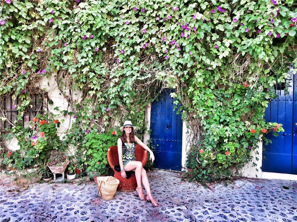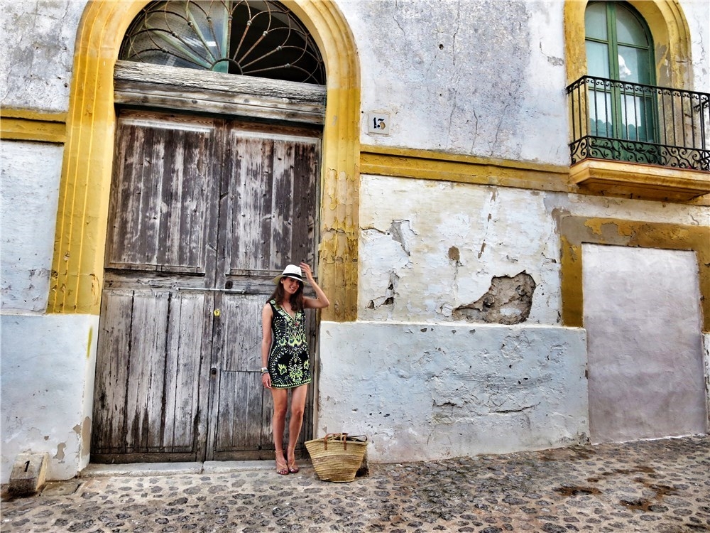 La modelo ha publicado dos imágenes, una tomada en Dalt Vila y otra frente a una fachada cubierta por una frondosa buganvilla, ambas luciendo el mismo outfit decorado por dos complementos comprados en la isla: un tradicional senalló y un sombrero.