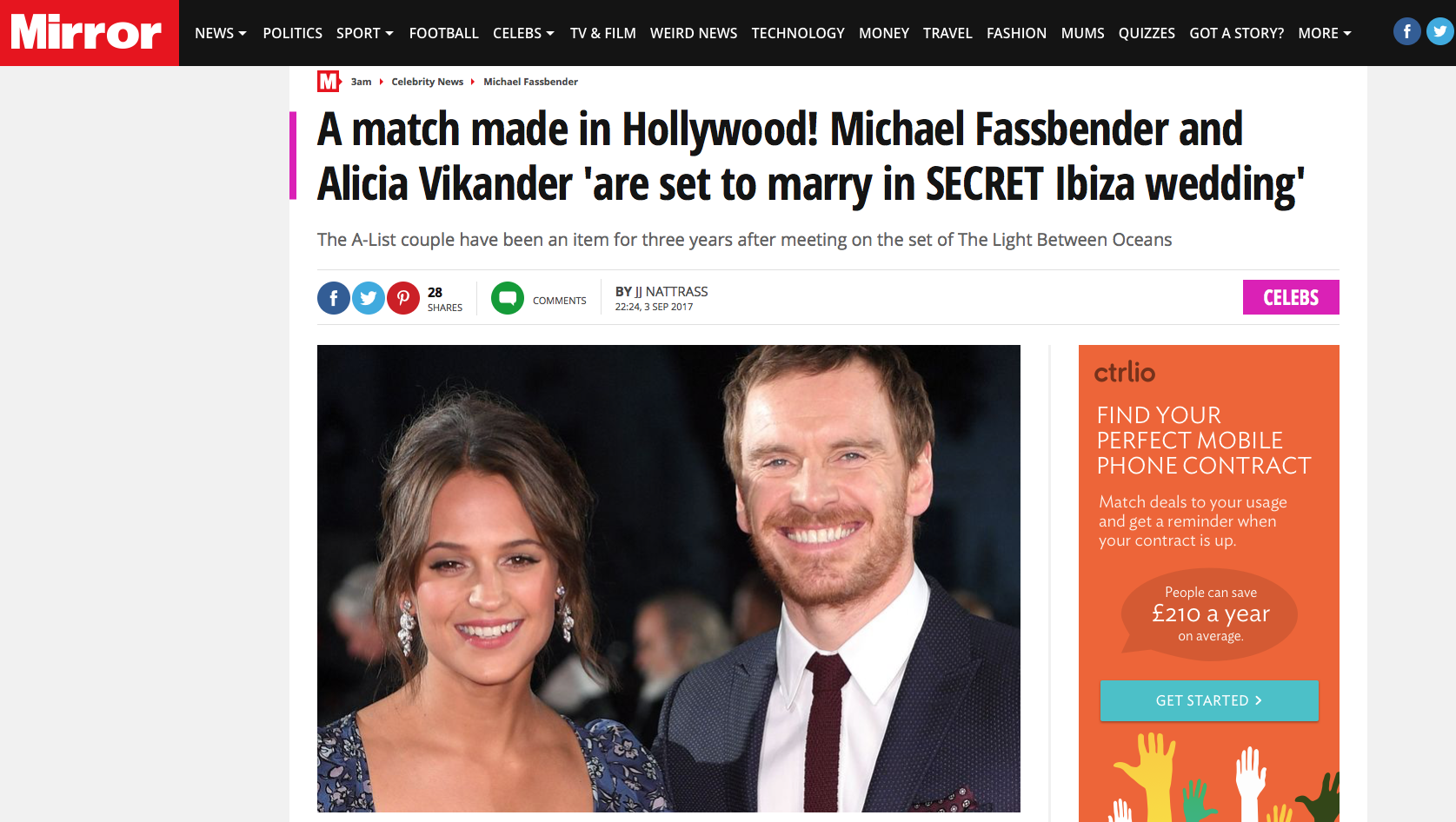 @Noudiari/El actor Michael Fassbender (40 años) planea casarse con la también actriz, Alicia Vikander (28 años) en una ceremonia secreta en Ibiza, el próximo mes. Así lo han dado a conocer una decena de medios británicos, sobre una de las parejas «más discretas de Hollywood», según les ha calificado The Mirror.