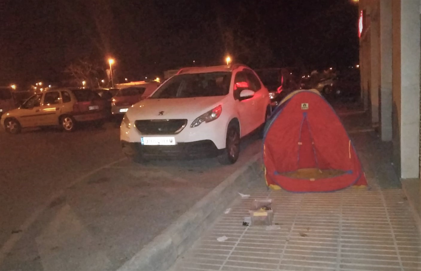Como se aprecia en la imagen, el campamento está instalado en la acera del aparcamiento que se encuentra enfrente de las oficias de correos. Entre coches, junto al asfalto y sin ningún tipo de sujeción.
