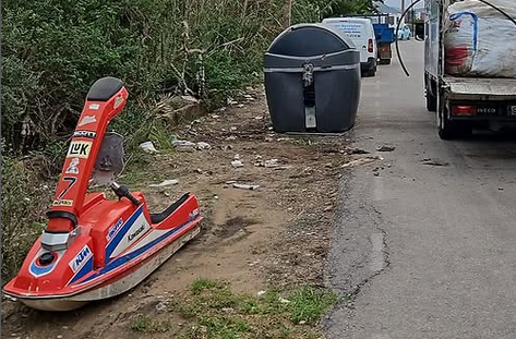 La Policía Local de Ibiza ha denunciado a un ciudadano que dejó una moto de agua abandonada junto a los contenedores en la calle Sa Punta, intentando deshacerse de ella sin seguir el procedimiento legal. El hecho, compartido por el cuerpo en sus redes sociales, ha generado una gran repercusión por lo insólito de la escena.