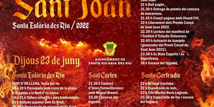 El Ayuntamiento de Santa Eulària des Riu ha preparado para esta ‘Nit de Sant Joan’ varias actividades repartidas por el municipio y que incluyen los tradicionales ‘foguerons’, actuaciones musicales y comidas tradicionales como los ‘macarrons de Sant Joan’ o las ‘coques d’aubercocs’, así como talleres infantiles dentro de la fiesta de sa Font d’en Lluna, que se realiza por la tarde para que los más pequeños puedan disfrutar de ese día al tiempo que conocerán la leyenda de ‘es fameliar’, que solo puede conseguirse en esta noche del año. Así lo ha dado a conocer en el día de hoy el Consistorio. «Para evitar incidentes, se establecerán controles de acceso a las hogueras en Santa Eulària y es Puig d’en Valls. Además, se recuerda la prohibición de hacer fuego en la playa y se reforzarán los servicios de Policía Local y Protección Civil para responder ante cualquier eventualidad», ha advertido el equipo de gobierno municipal en una nota de prensa al respecto.