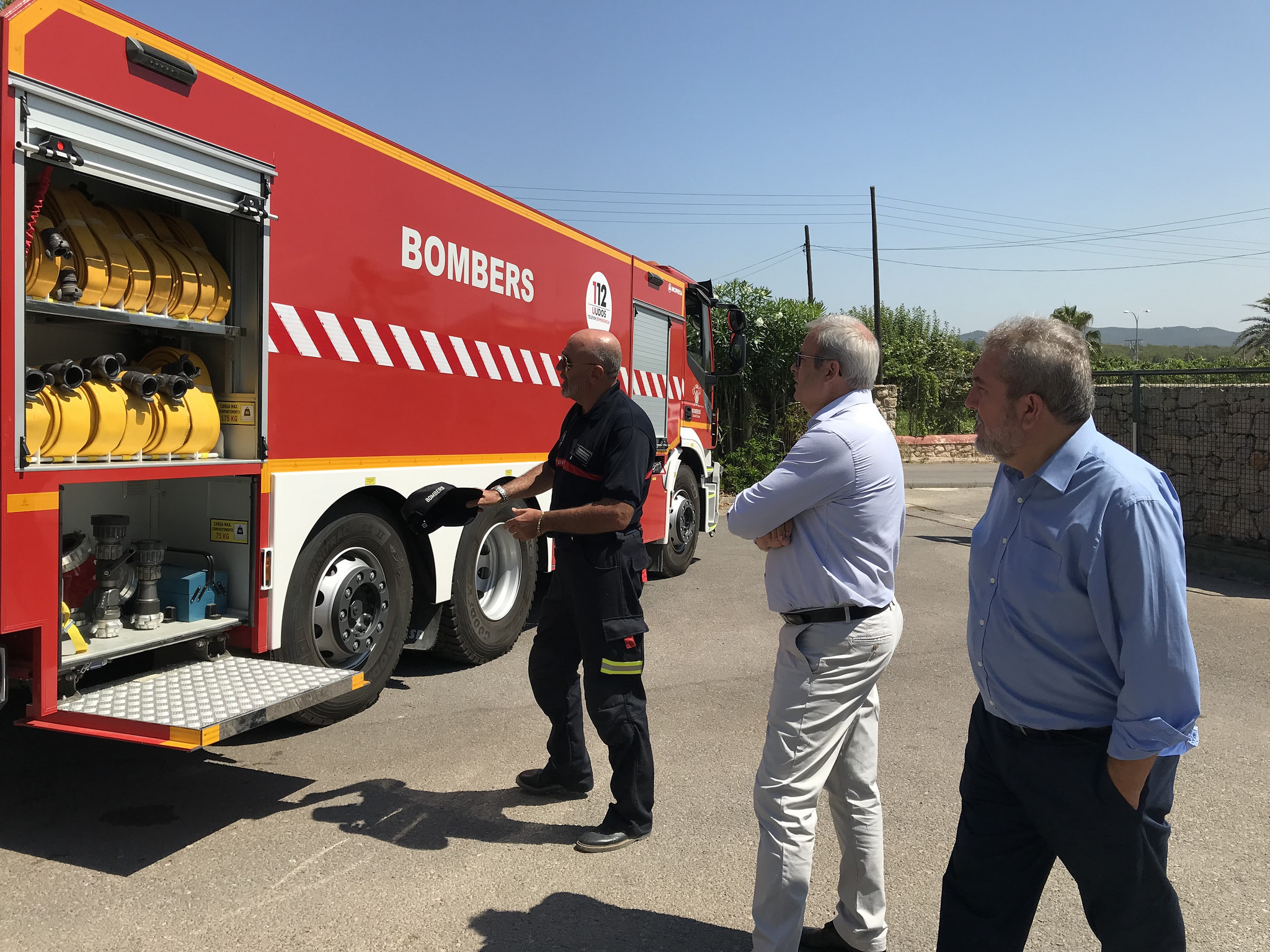 El presidente del Consell, Vicent Torres, acompañado del conseller de Economía, Hacienda, Medio Ambiente y Medio Rural y Marí, Gonzalo Juan, y el jefe del Parque Insular de Bomberos, Miguel Sevilla, han presentado hoy la nueva autobomba, que sustituirá a otra de similares características, pero capacidad inferior del año 1985, ha informado la institución hoy en una nota.