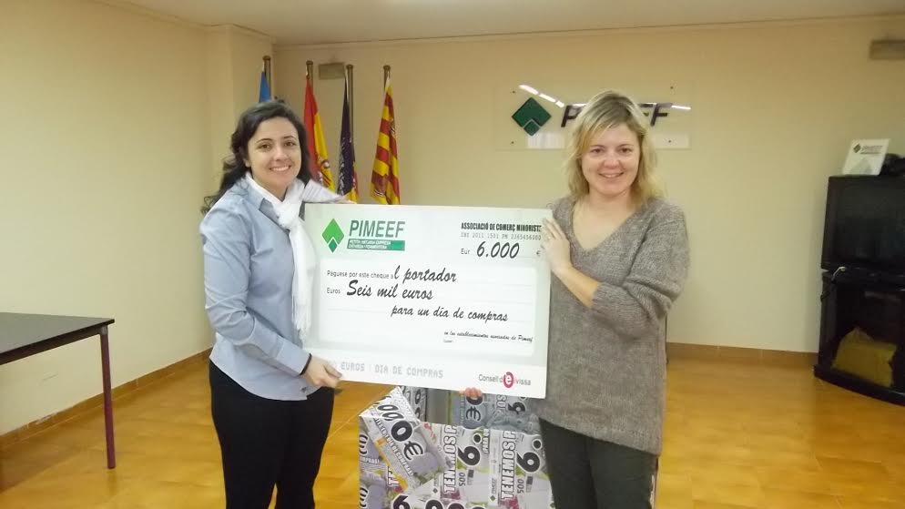 @Noudiari / Nuria Barberá, ganadora del sorteo de los 6.000 euros organizado por la Pimeef, gastará el próximo viernes, 17 de enero, el premio que le ha tocando yendo de compras por algunos de todos los comercios que han participado en la campaña de este año. La secretaria general de la asociación empresarial pitiusa, María Ángeles Marí, le ha hecho hoy entrega del cheque honorífico.