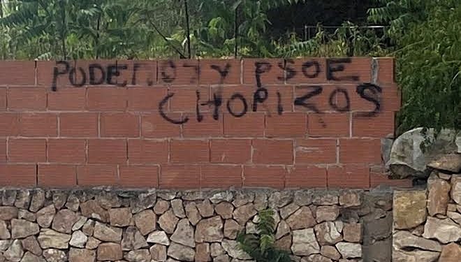 En la pintada, que se encuentra sobre un muro de ladrillos levantado encima de una pared de piedra, se puede leer ‘Podemos y PSOE, chorizos’, como se puede apreciar en la imagen que acompaña estas líneas.