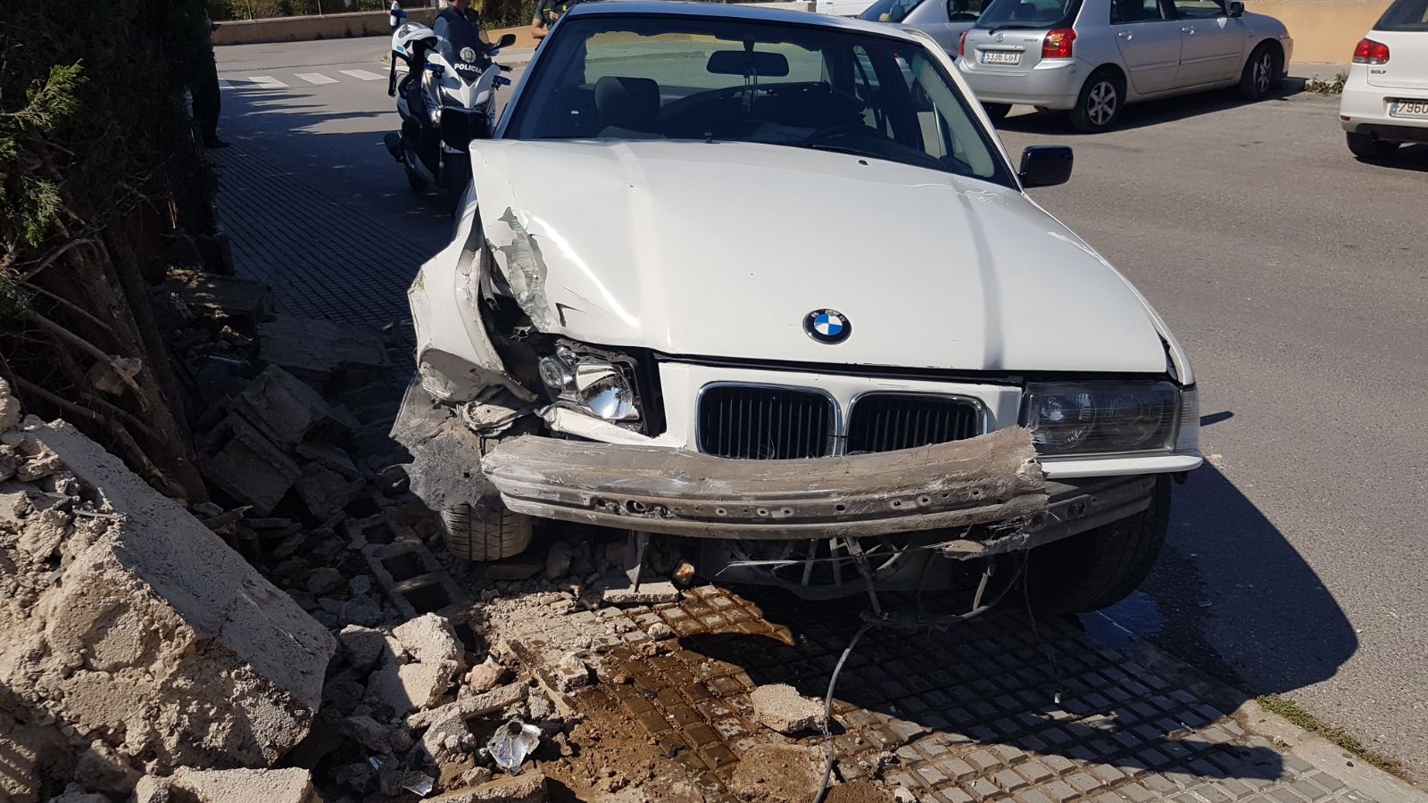 @Noudiari/Un conductor perdió ayer el control de su vehículo y chocó contra un muro de la calle Romaní de ses Païsses. No hubo heridos, pero sí destrozos materiales tanto en el vehículo como en el muro contra el que se empotró el conductor de este BMW.