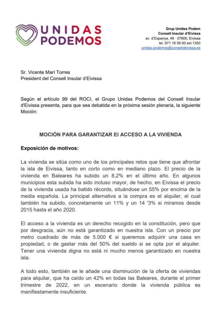 Desde Unidas Podemos Ibiza han presentado este jueves la propuesta que llevarán el viernes al pleno del Consell d’Eivissa para que se adopten un conjunto de medidas para facilitar el acceso a la vivienda, unas medidas que han sido presentadas por los portavoces insulares de cada isla recientemente.