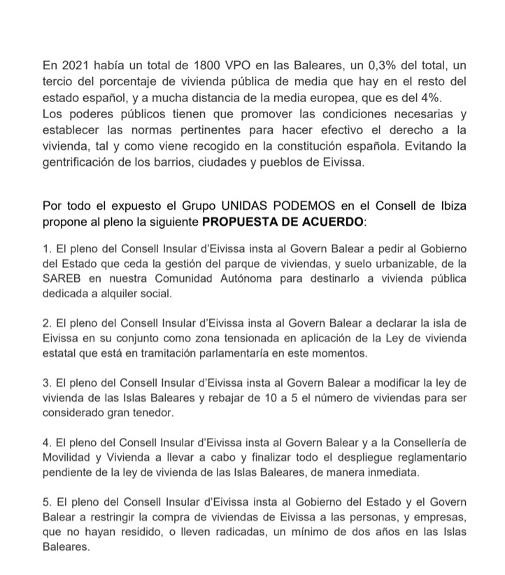 También se ha contemplado que la Sareb ceda tanto sus activos como el suelo urbanizable para destinarlo a vivienda pública y rebajar a cinco el número de viviendas para ser considerado gran tenedor «con el fin de facilitar el acceso a una vivienda digna». Además, piden que el pleno del Consell inste a la conselleria balear de Vivienda, dirigida por el socialista ibicenco Josep Marí Agustinet, a «llevar a cabo y finalizar todo el despliegue reglamentario pendiente de la ley de vivienda de las Islas Baleares».