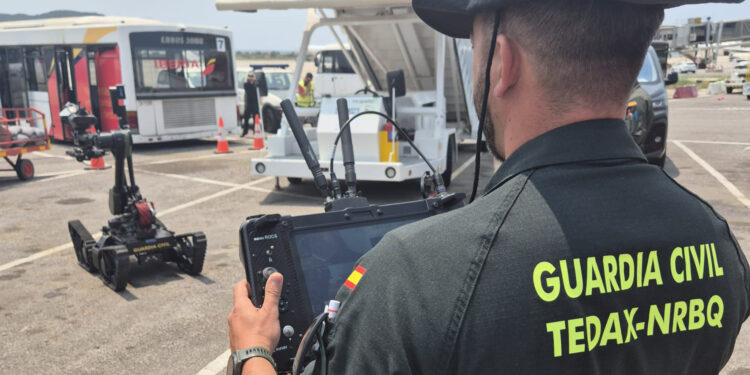 En el Aeropuerto de Ibiza se realizaron prácticas de entrada y desactivación simulada de artefactos en el interior de un autobús situado en la zona de embarque, poniendo a prueba la capacidad de actuación en espacios confinados y de alto tránsito.