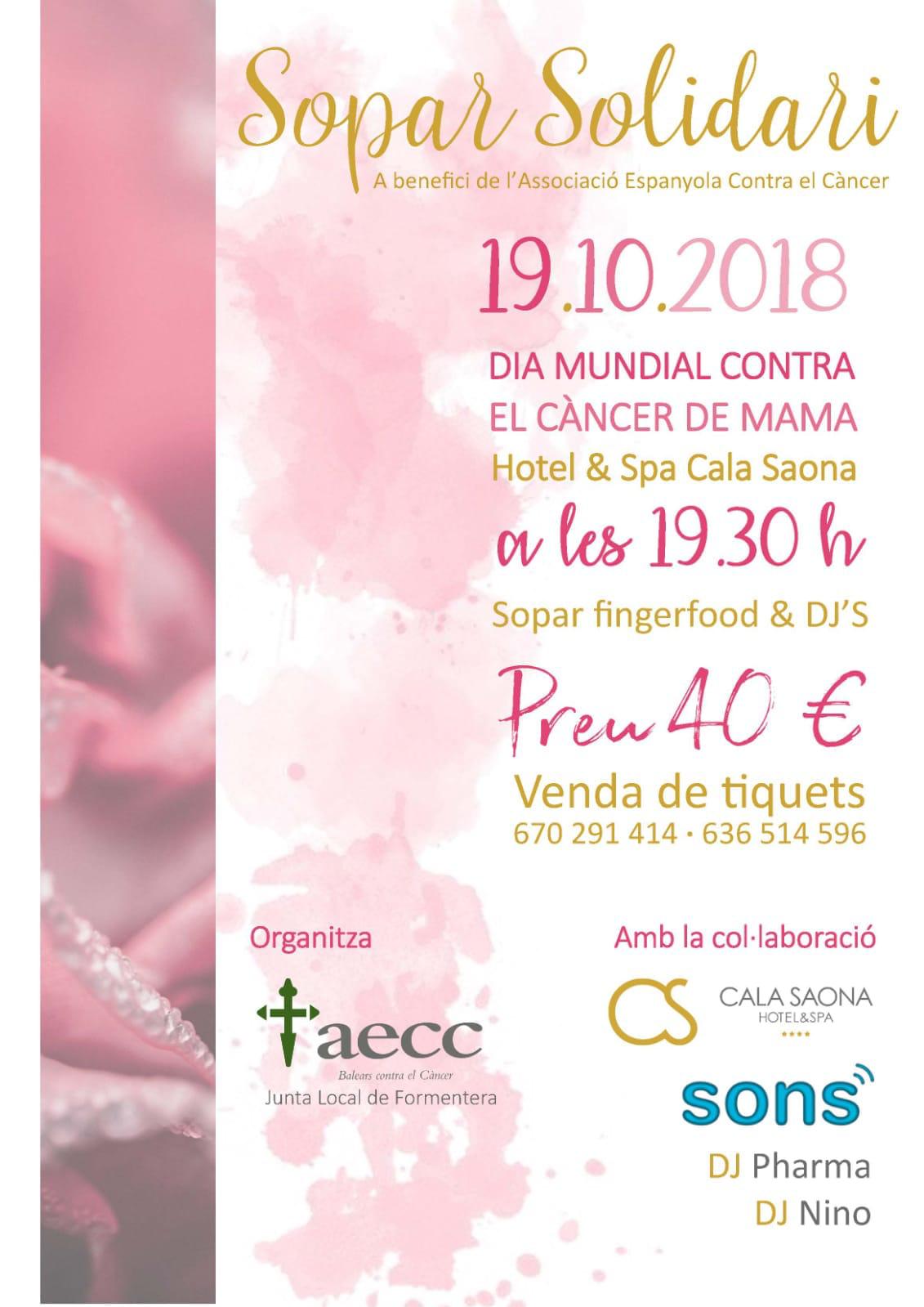 El mateix divendres, l’AECC muntarà una taula informativa a la plaça de Sant Francesc. Aquella mateixa nit, es celebra un sopar solidari a benefici de l’associació en el restaurant de l’hotel Cala Saona per un preu de 40 euros. La reserva es pot fer en els telèfons 670 291 414 o 636 514 596. La vetllada estarà animada amb música i es farà una rifa de dos regals, un quadre donació de na Teresa Matilla i una joia donada per n’Enric Majoral, als que la presidenta de l’AECC ha agraït la seva solidaritat.
