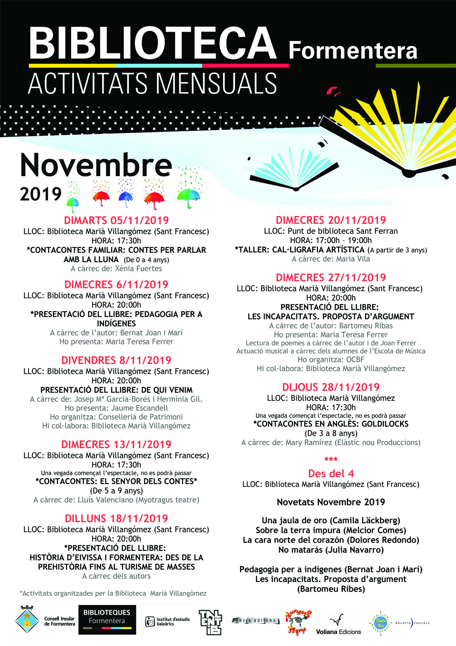 @Noudiari / El Consell de Formentera, a través de l’àrea de Cultura, ha presentat les activitats organitzades per les biblioteques de Formentera per aquest mes de novembre. Durant aquest mes es faran 4 presentacions de llibres de diferents temàtiques i 4 activitats dirigides a infants.