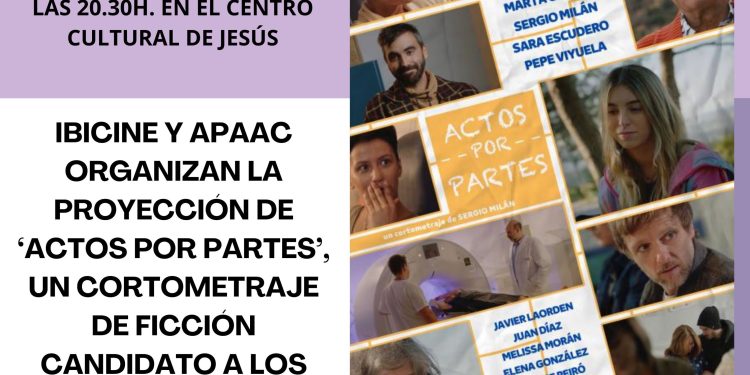 El cortometraje ‘Actos por partes’, candidato a los Premios Goya 2024 y ganador ya de 46 galardones, se proyectará el miércoles 18 de octubre en el Centro Cultural de Jesús en el marco del Día Mundial del Cáncer de Mama, que se celebra el día 19, una actividad organizada por Ibicine y por la Asociación Pitiusa de Ayuda a Afectados/as de Cáncer (Apaac).