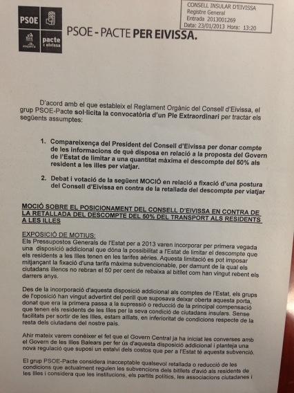 El PSOE-Pacte del Consell de Eivissa ha solicitado hoy la celebración de un pleno extraordinario para que comparezca el presidente de la máxima institución insular, Vicent Serra, y explique las informaciones de las que dispone en relación a la propuesta del Gobierno central de reducir en un 50 por ciento el descuento de residente del que gozan los ciudadanos de Baleras para viajar en barco y avión. Asimismo, quiere someter a votación una moción para manifestar el rechazo de la institución ante la posibilidad de que se apliquen dichos recortes. Según el reglamento del Consell, la sesión plenaria tendría que llevarse a cabo en el transcurso de los próximos 15 días hábiles, recuerdan los progresistas.