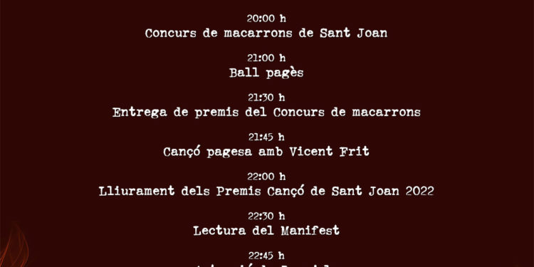 Enguany el programa festiu s’obrirà amb un concurs de macarrons de Sant Joan, i continuarà amb ball pagès, a càrrec de la colla Els Xacoters de sa Torre, seguit de l’actuació musical de Vicent Frit, el lliurament dels Premis de Cançó Nit de Sant Joan 2022, lectura del manifest i, finalment, l’actuació de Juanjele, guanyador del Concurs Cançó de Sant Joan 2021. Finalment, la colla de dimonis, es Mals Esperits i es Esperitrons, encendran la foguera.