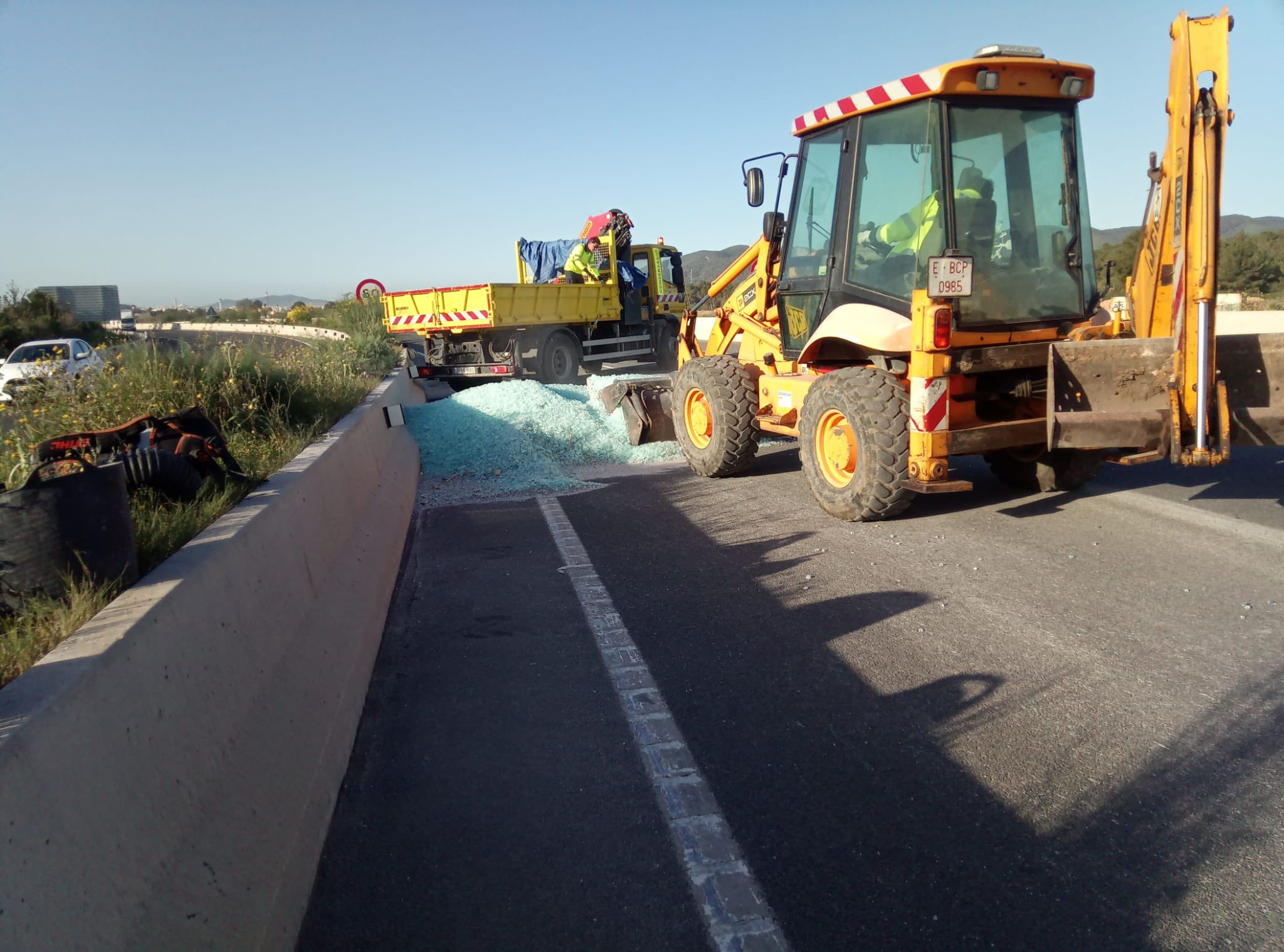El Consell de Ibiza aplaude el trabajo de los operarios de Xarxa Viària, que han logrado limpiar de manera rápida y efectiva los restos de la carga de un camión que ha volcado y ha derramado la mercancía en la carretera de Santa Eulària hoy, sobre las 7 de la mañana.