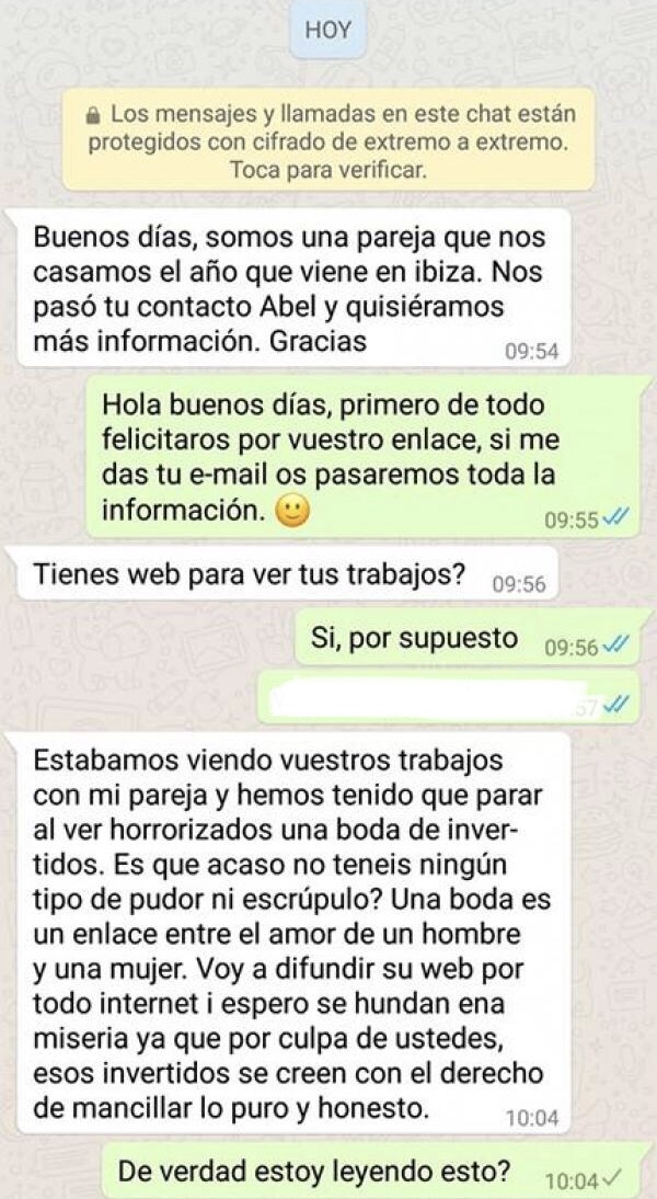 «Estábamos viendo vuestros trabajos co mi pareja y hemos tenido que parar al ver, horrorizados, una boda de invertidos. ¿Es que no tenéis ningún tipo de pudor ni escrúpulo? Una boda es un enlace entre el amor de un hombre y una mujer. Voy a difundir su web por todo Internet y espero que se hunda en la miseria, ya que por culpa de ustedes esos invertidos se creen con el derecho a mancillar lo puro y lo honesto», reza el mensaje enviado.