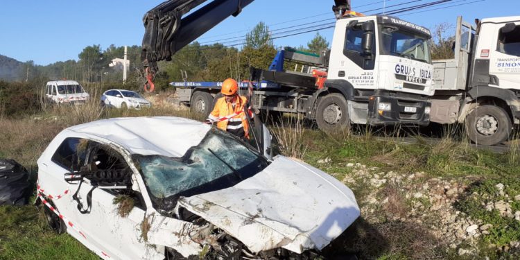 Para retirar el coche accidentado ayer en la carretera de Cala Llonga, Santa Eulària, en el que viajaban cinco personas que resultaron heridas de diversa consideración, ha sido necesaria la actuación de una pluma de gran tonelaje de Grúas Ibiza después del intento fallido ayer para sacar el coche con dos camiones más pequeños.