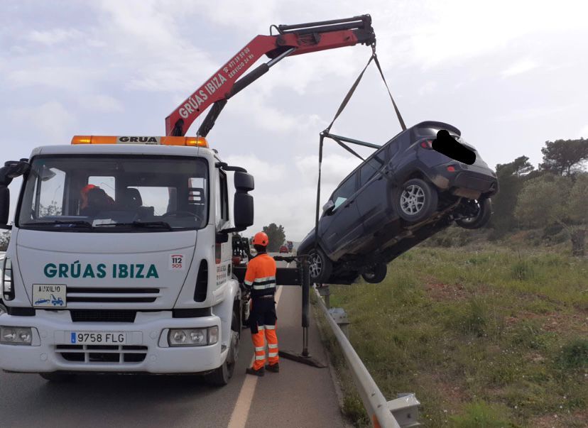 Tras el intento fallido de recuperación del coche por parte de algunas empresas de asistencia, finalmente han sido dos equipos de auxilio en carretera de Grúas Ibiza quienes se han encargado de rescatar el vehículo, uno de ellos mediante una grúa pluma, tal y como se puede comprobar en las imágenes.