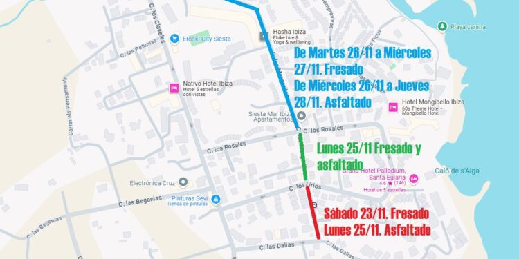 Dada la extensión de la vía los trabajos se han dividido en tramos de forma que los cortes viarios afecten en cada momento el mínimo imprescindible del trazado. Así, entre mañana y el lunes se ejecutarán los trabajos en el tramo de la calle Margalides comprendido entre las calles Dàlies y Lliris, en la parte alta de es Puig d’en Fita.