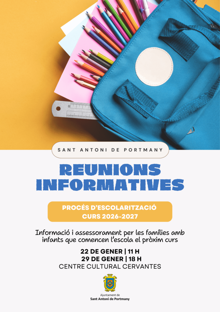 Con el objetivo de orientar a las familias y resolver posibles dudas sobre el proceso de escolarización, el Ayuntamiento de Sant Antoni ha organizado dos reuniones informativas que se celebrarán el día 22 de enero a las 11 horas y el 29 de enero a las 18 horas en el Auditori del Centre Cultural Cervantes, situado en la calle Estrella, número 17.