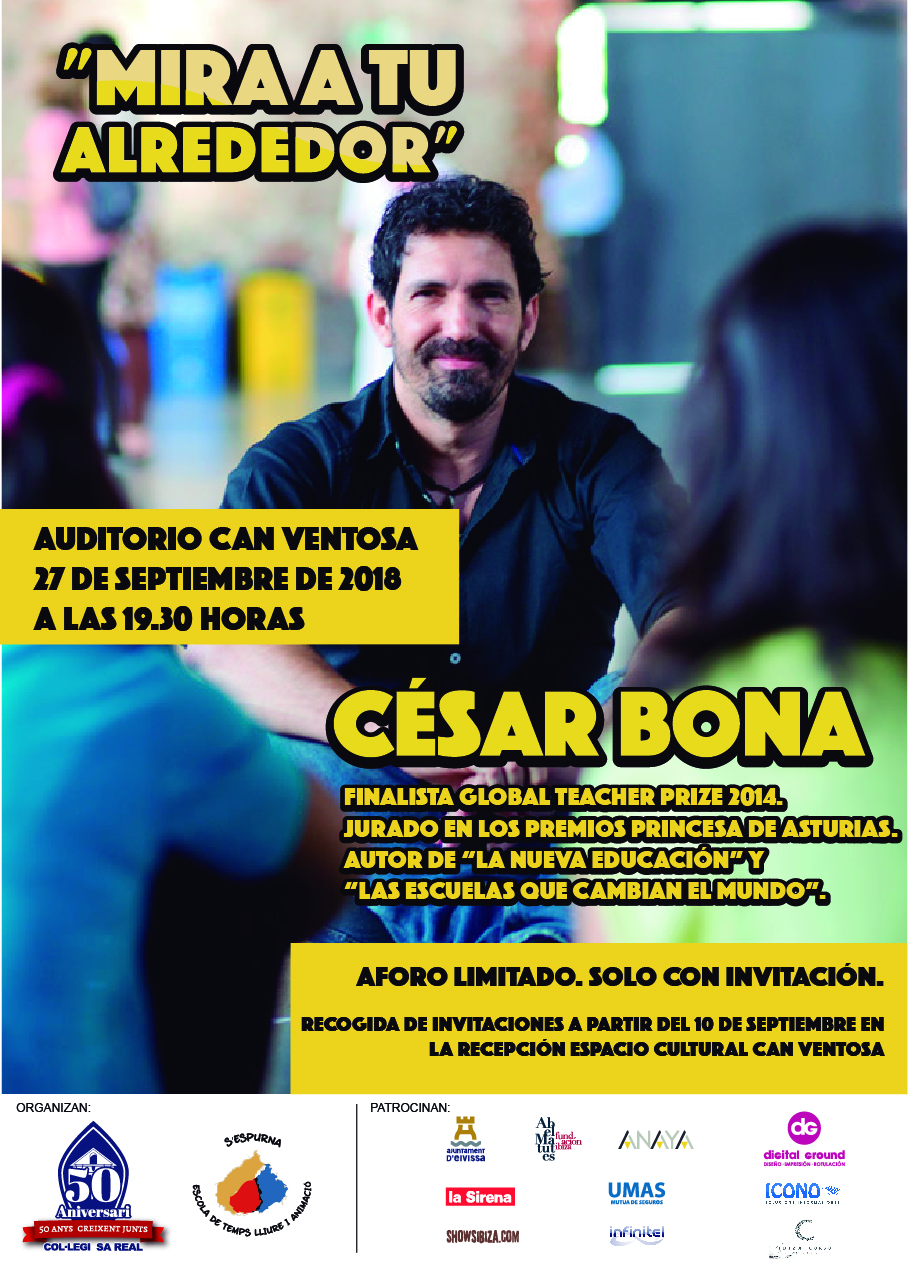 La primera de las tres conferencias será el próximo jueves 27 de septiembre a las 19.30 y tendrá lugar en el auditorio de Can Ventosa. La conferencia contará, de nuevo, con la intervención del actual referente educativo César Bona. Maestro finalista en 2014 del premio Global Teacher Prize y autor de los libros La nueva educación (2015) y Las escuelas que cambian el mundo (2016) visitará Can Ventosa, donde impartirá la conferencia “Mira a tu alrededor”.